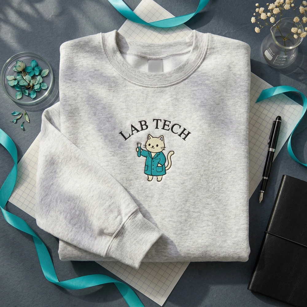 The Lab Tech Embroidered Sweatshirt is a premium machine-embroidered top featuring a kawaii science cat in a teal lab coat—the perfect cozy gift for lab pros.