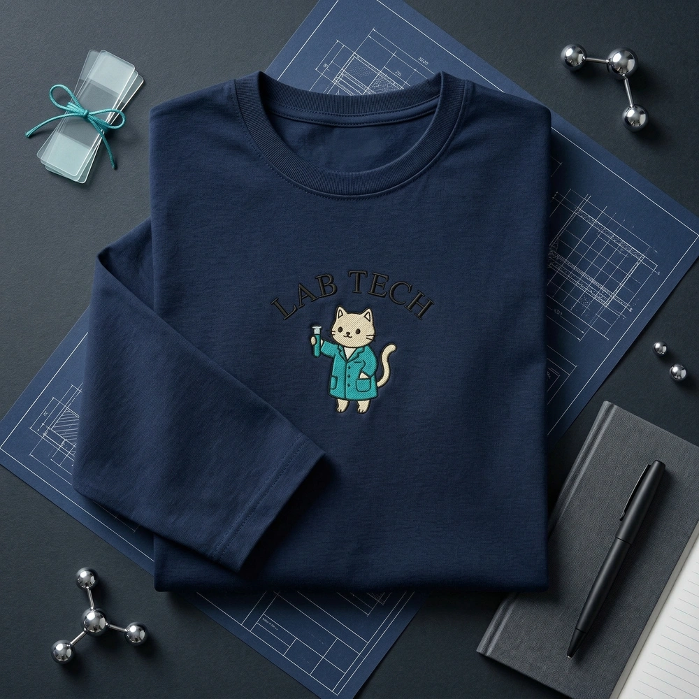 This design features a high-density 8cm x 8cm embroidery centered on a premium Light Heather Grey garment. The design uses three distinct thread colors: a crisp black for the “LAB TECH” curved sans-serif text and outlines, a soft cream for the cat’s body, and a vibrant teal for the laboratory coat and test tube liquid. The use of professional satin stitches for the lettering and solid fill stitches for the character ensures a durable, high-quality finish that stands up to frequent washing.