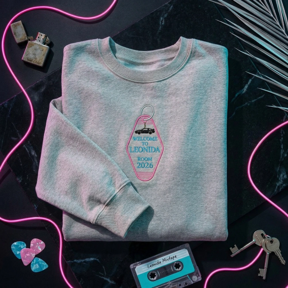 Leonida Motel Embroidered Sweatshirt featuring a vintage Vice City souvenir design. This Room 2026 gaming apparel is perfect for fans of Leonida merch.