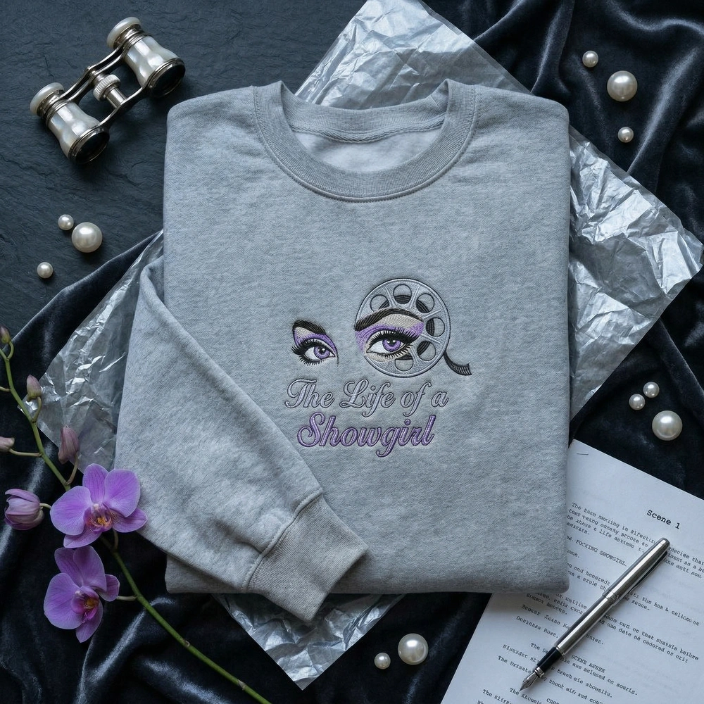 The Life of a Showgirl Embroidered Sweatshirt features a premium minimalist design with striking violet eyes and a retro film reel—perfect for the 2026 music era.