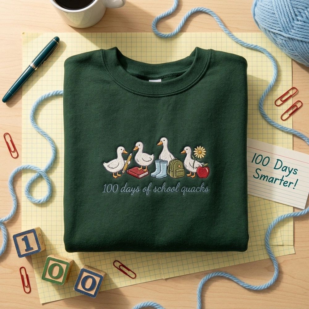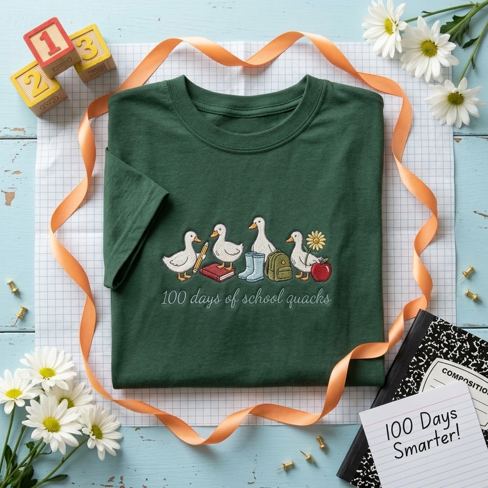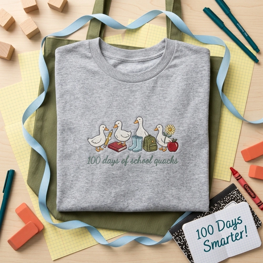 This original composition is machine-embroidered on a premium Navy garment, featuring a 20cm x 12cm horizontal design on the chest. The artwork includes four white ducks rendered in solid fill stitches with clean running stitch outlines. Each character has unique details: a pink bow and yellow pencil, blue floral rainboots and a red book, an olive green backpack, and a yellow daisy with a red apple. The phrase ‘100 days of school quacks’ is executed in a raised satin stitch using dark teal thread for a premium, tactile feel. We use 8 distinct thread colors to ensure the vibrant palette pops against the dark fabric.