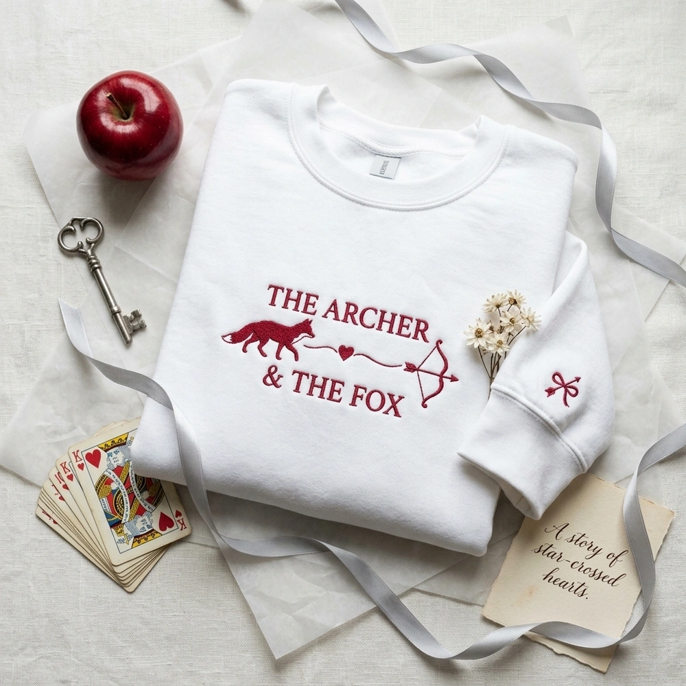 This premium garment features a comprehensive three-location embroidery set. The center chest showcases the text “THE ARCHER & THE FOX” in a clean serif font, flanked by a solid fox silhouette and a detailed bow and arrow icon. The design is mirrored on the sleeve cuffs for a hidden detail effect: a bow and arrow on the left cuff and a fox on the right, both accented with small hearts. The entire design is stitched in a single, deep crimson thread (#990011) that provides a romantic, high-contrast look against the light pink fabric. We use a dense satin stitch for the icons and a hybrid stitch for the lettering to ensure professional durability and legibility. The chest embroidery measures 22cm x 12cm, with 4cm x 4cm accents on each sleeve.