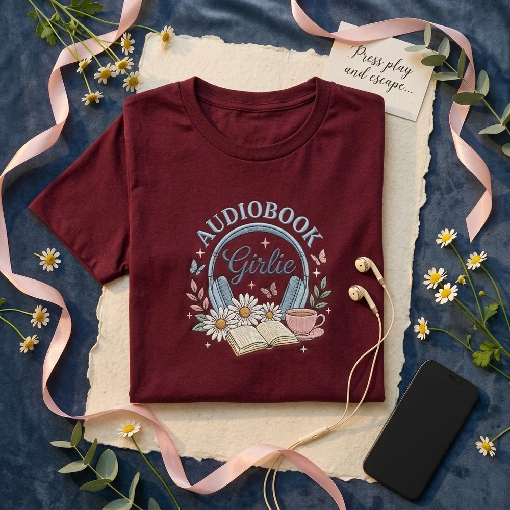 This intricate design features the phrase ‘AUDIOBOOK Girlie’ in a stunning multi-textured layout. The word ‘AUDIOBOOK’ is arched in a light blue block font, while ‘Girlie’ is rendered in an elegant dark blue script nestled within a pair of detailed over-ear headphones. The design is framed by white daisies with warm yellow centers and sage green leaves, alongside an open book and a delicate pink teacup. Utilizing 7 premium thread colors—including Soft Pink, Light Blue, and Sage Green—the 12cm x 12cm center-chest placement uses a mix of solid fill and crisp running stitches for a professional, 3D finish.