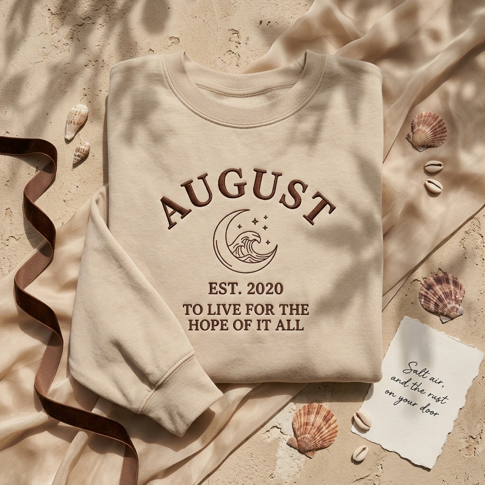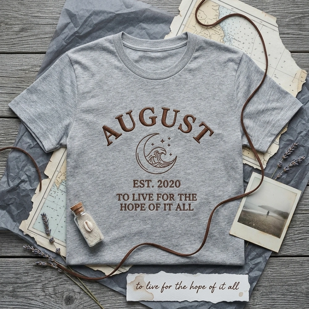 This sophisticated center-chest composition is professionally embroidered on a soft Sand-colored garment using a single, rich chocolate brown thread (#5C4033). The word “august” is arched at the top in a dense satin stitch, while a minimalist line-art graphic of a crescent moon and crashing wave sits centered below. The design is balanced by “EST. 2020” in a classic serif font and finished with the poignant lyric “to live for the hope of it all” at the base. Measuring approximately 18cm in width, the embroidery combines satin stitches for clarity and triple-running stitches for intricate wave details, ensuring long-lasting durability.