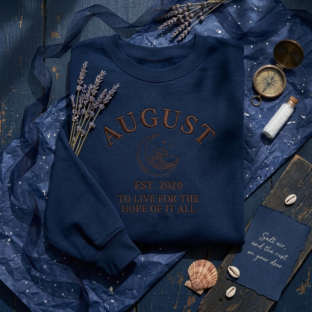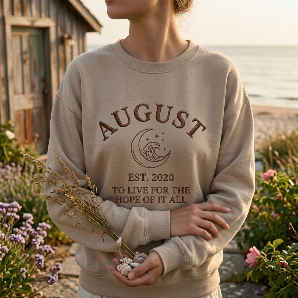 The August Lyric Embroidered Sweatshirt is a premium machine-embroidered top featuring a minimalist moon and wave design with nostalgic music lyrics.