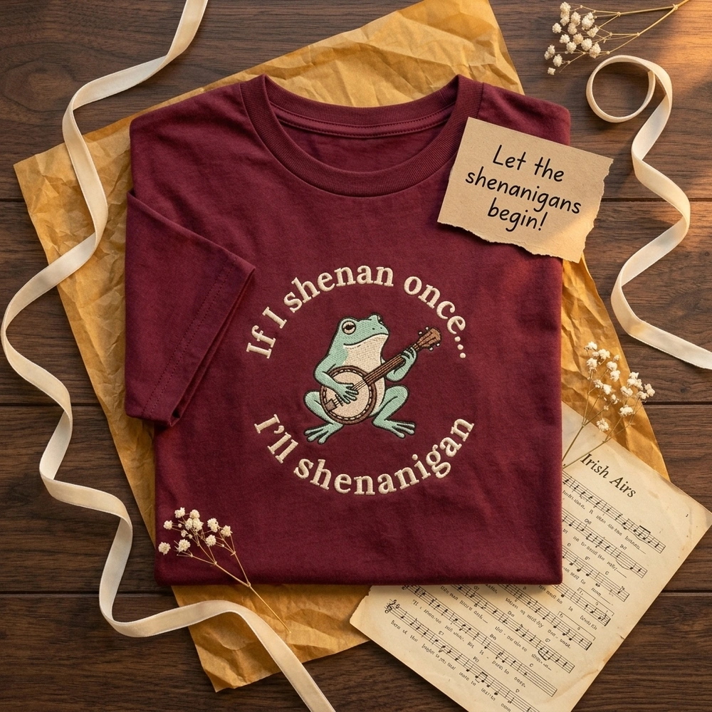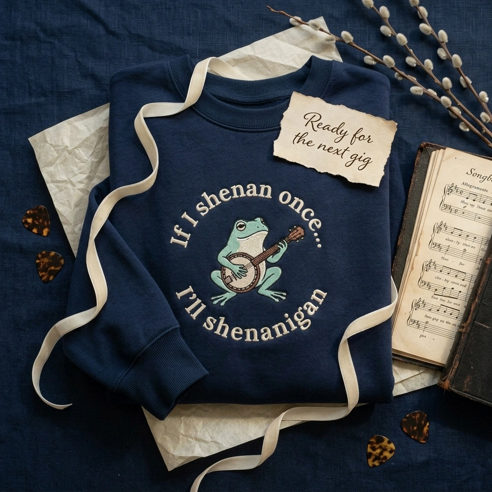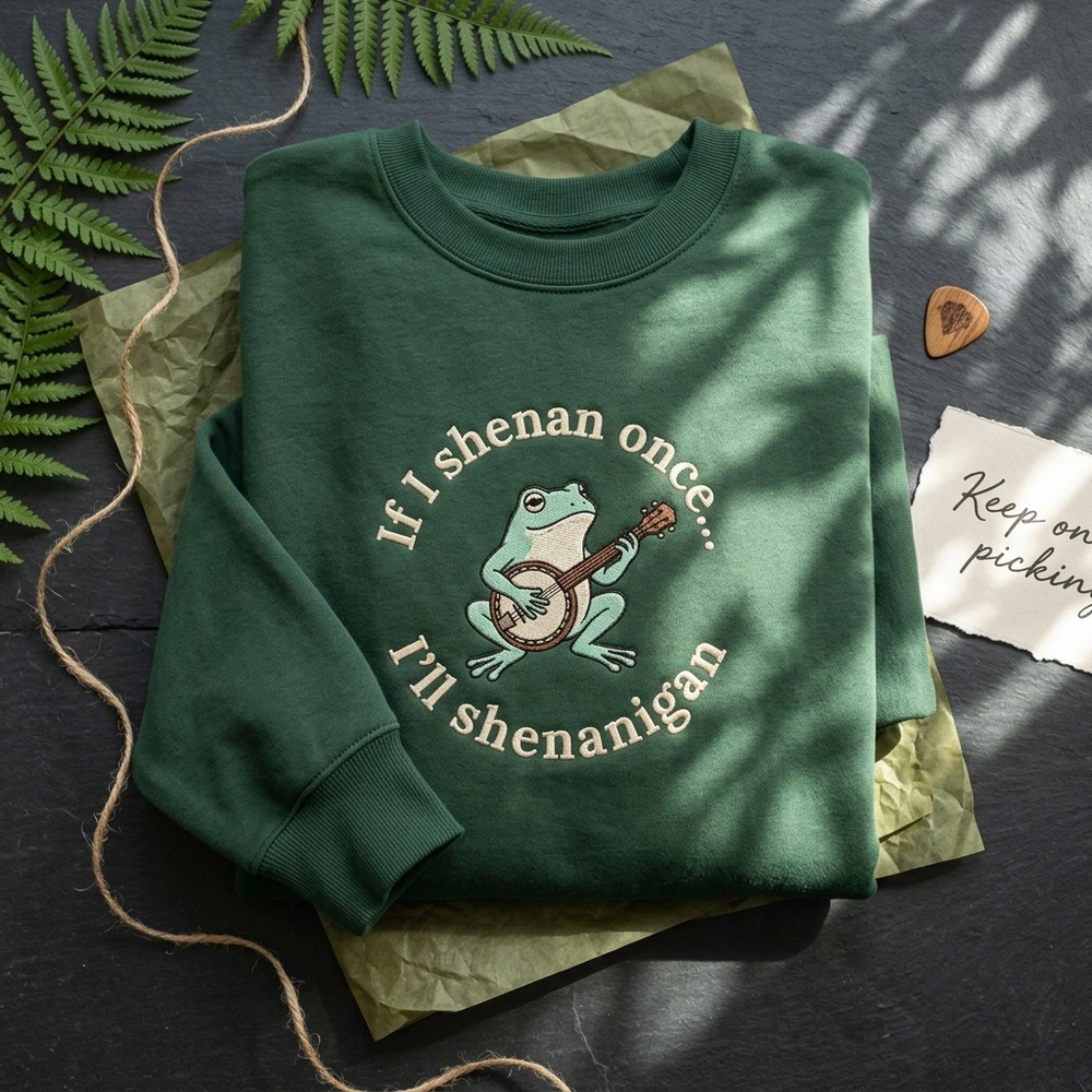 This original design is meticulously rendered on a rich Forest Green garment, providing a deep, natural backdrop for the vibrant embroidery. The centerpiece features a light green frog playing a folk banjo, created with a dense mint green fill stitch and dark green running stitch outlines for sharp definition. The accompanying text, “If I shenan once… I’ll shenanigan,” is executed in a premium cream-colored satin stitch that creates a raised, tactile texture. The entire composition measures 12cm x 12cm and utilizes five distinct thread colors (Mint Green, Cream, Dark Brown, Dark Green, and Black) to achieve its detailed, handcrafted look.