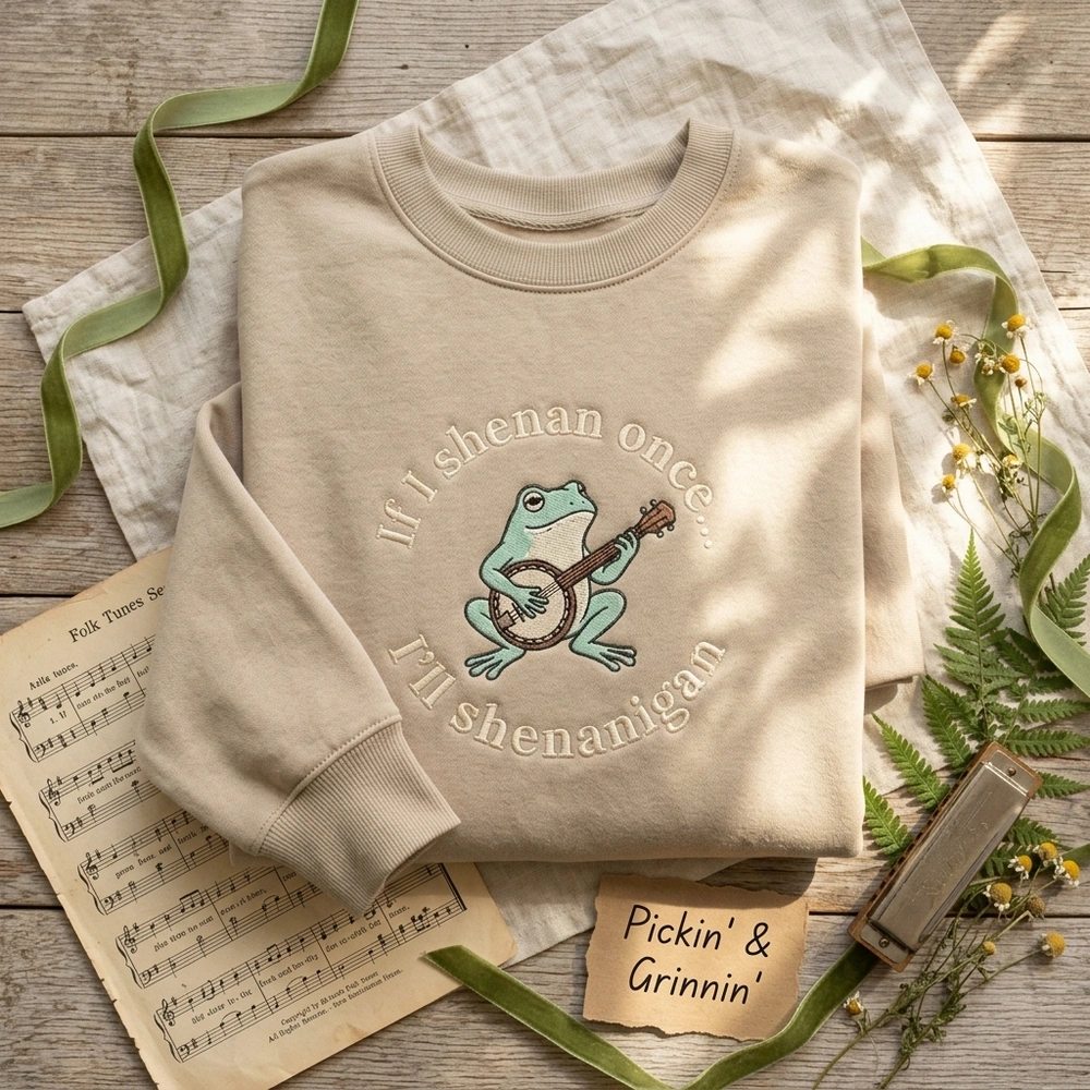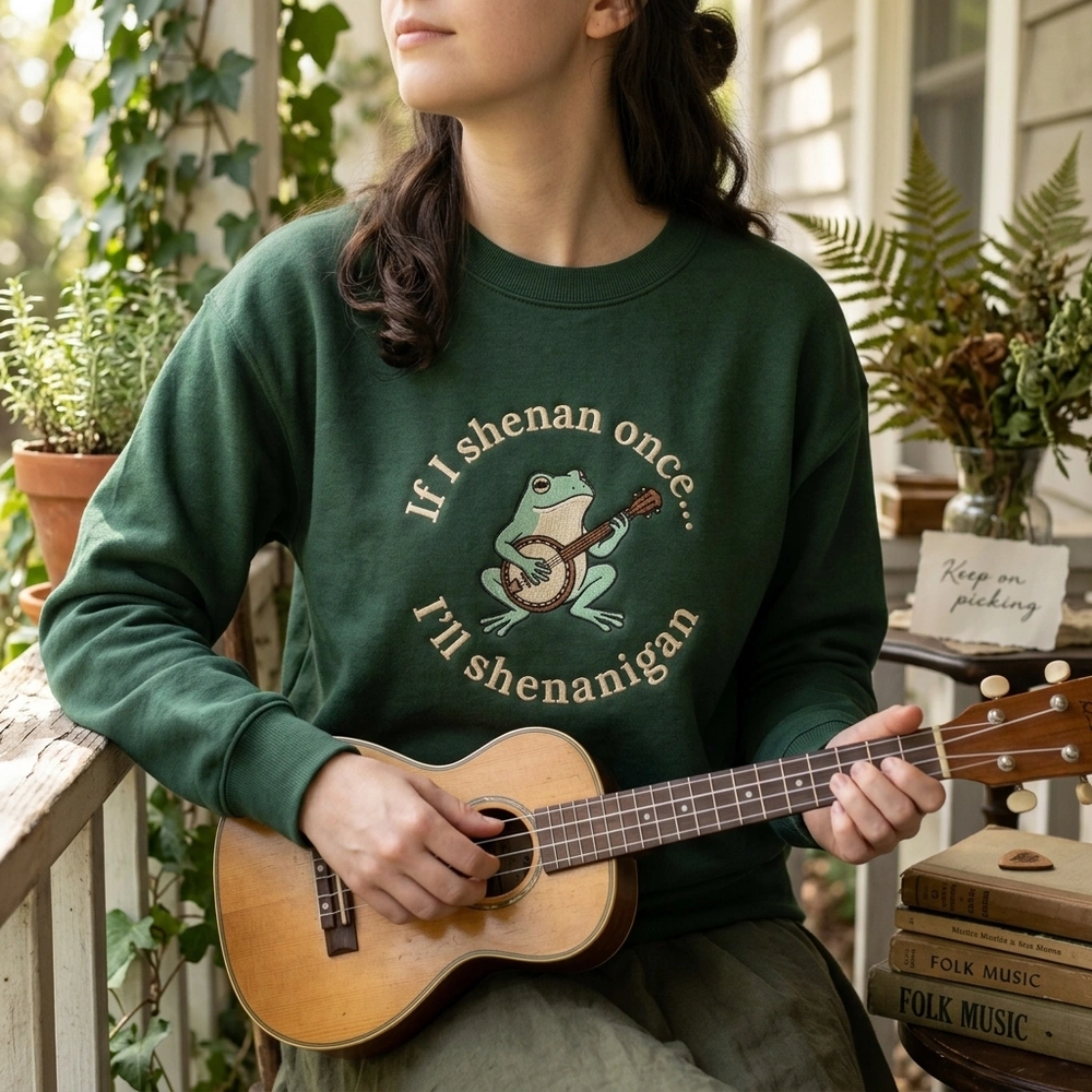 The Frog Playing Banjo Embroidered Sweatshirt is a premium machine-embroidered garment featuring a whimsical folk frog and a funny shenanigan pun.