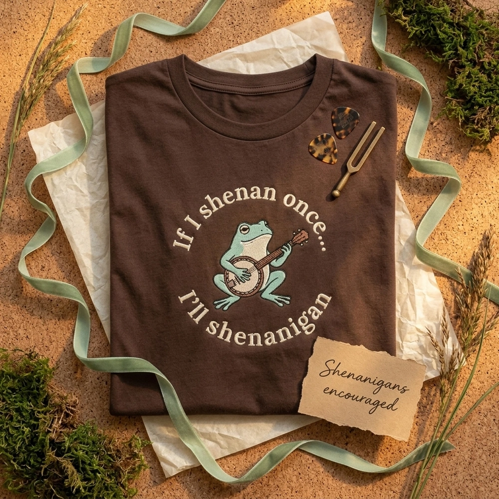 This design is inspired by the “frogcore” and “cottagecore” internet subcultures, which celebrate simple living, nature, and whimsical animals. It pairs a classic folk instrument with a playful pun on the word “shenanigans” for a lighthearted, folk-art vibe.