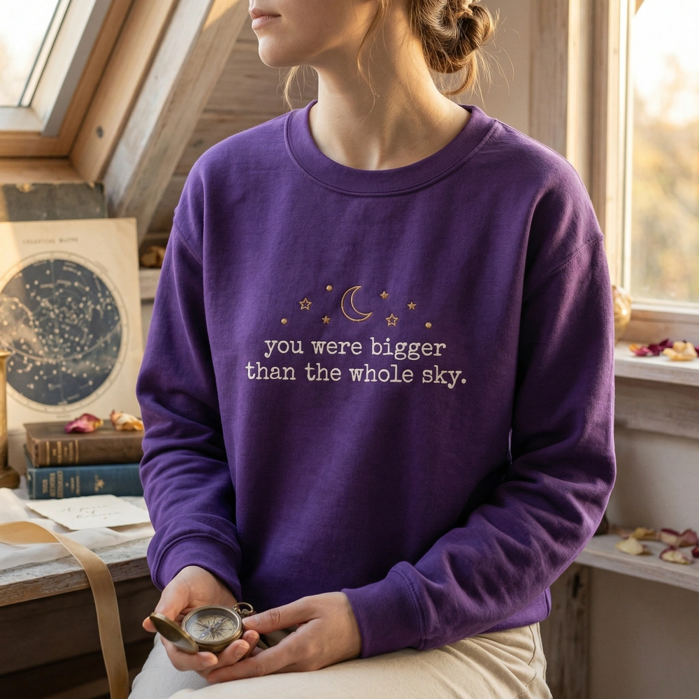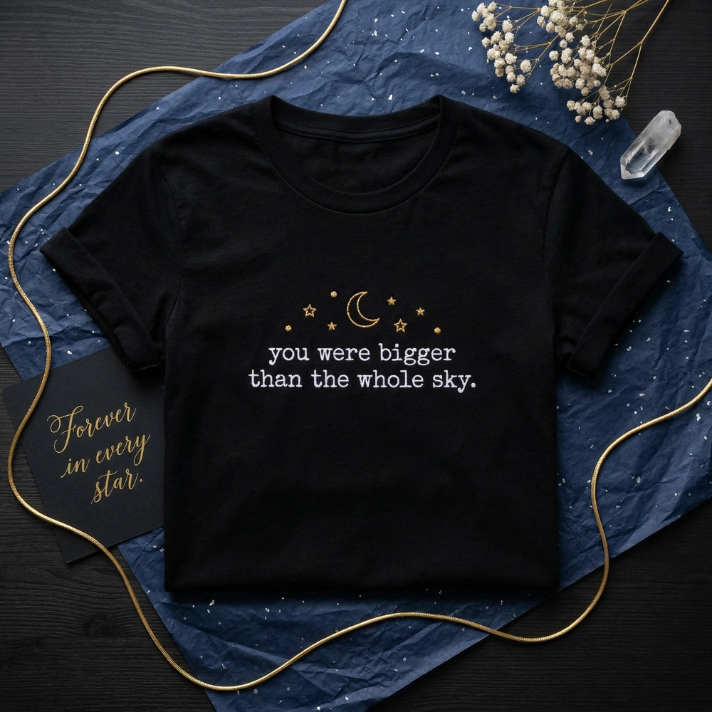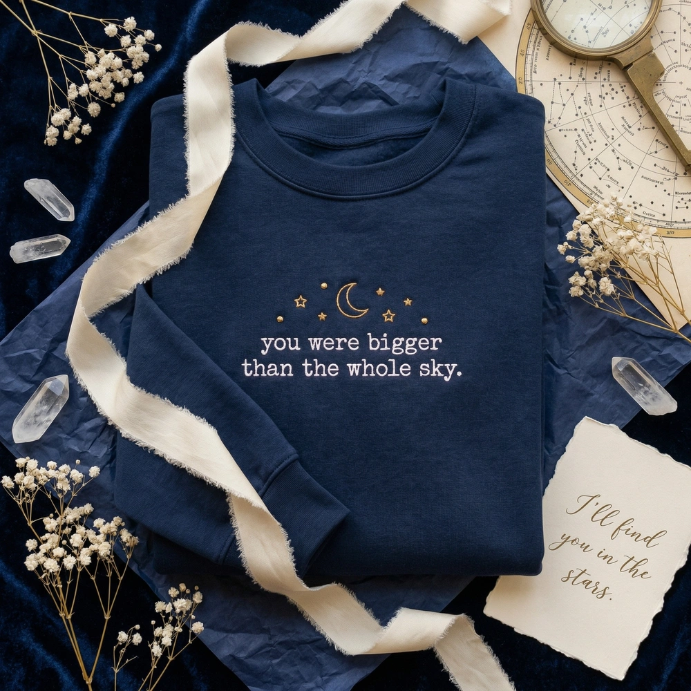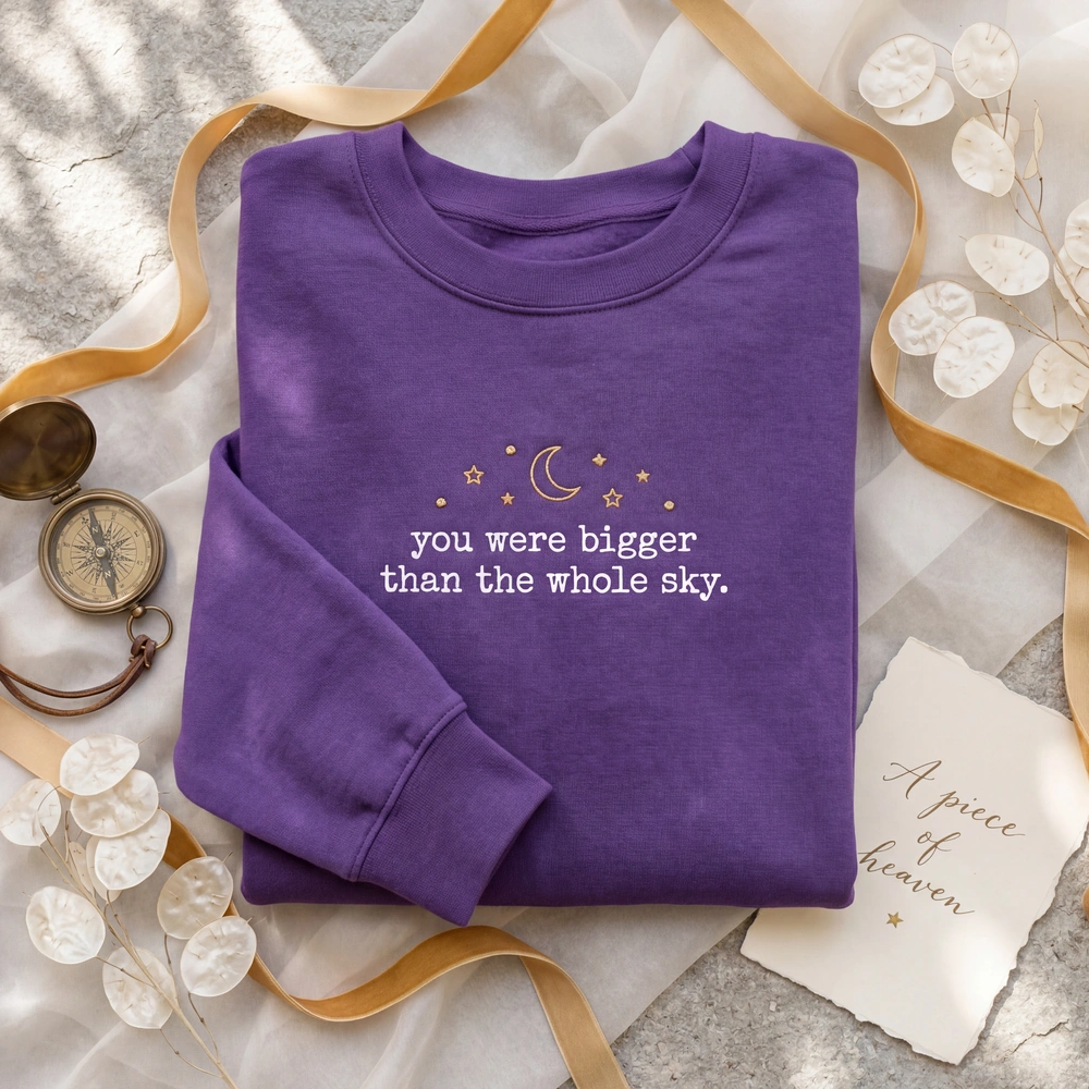 This piece is more than just apparel; it is a wearable tribute designed for those who find solace in the stars and the poignant words of loss and love. Whether you are a dedicated Swiftie or someone navigating the journey of grief, this celestial embroidered sweatshirt offers a subtle, comforting, and aesthetically beautiful way to honor a memory that was truly bigger than the whole sky. The minimalist design makes it versatile enough for daily wear while maintaining a deep, personal significance.