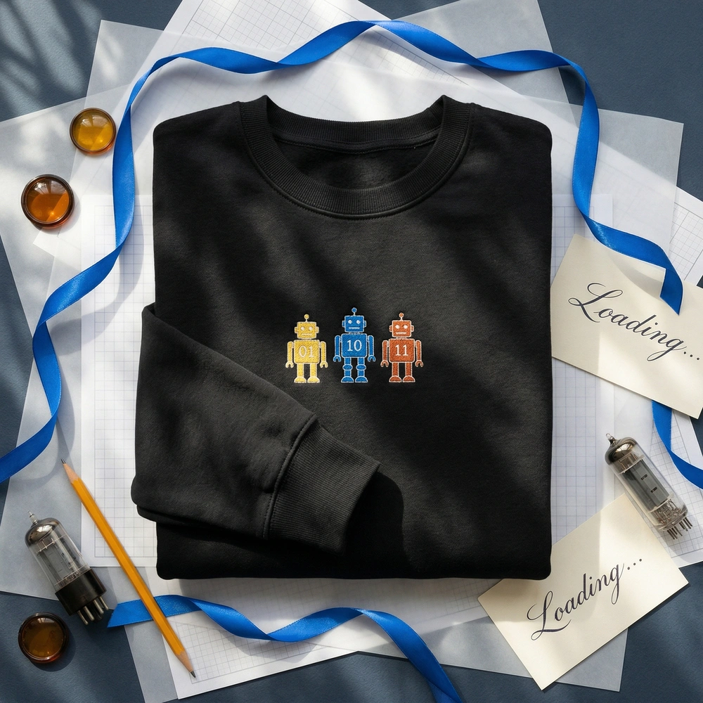The Lollidollyart Binary Bot Trio is a premium machine-embroidered sweatshirt for coders featuring retro robots—the perfect personalized tech gift.