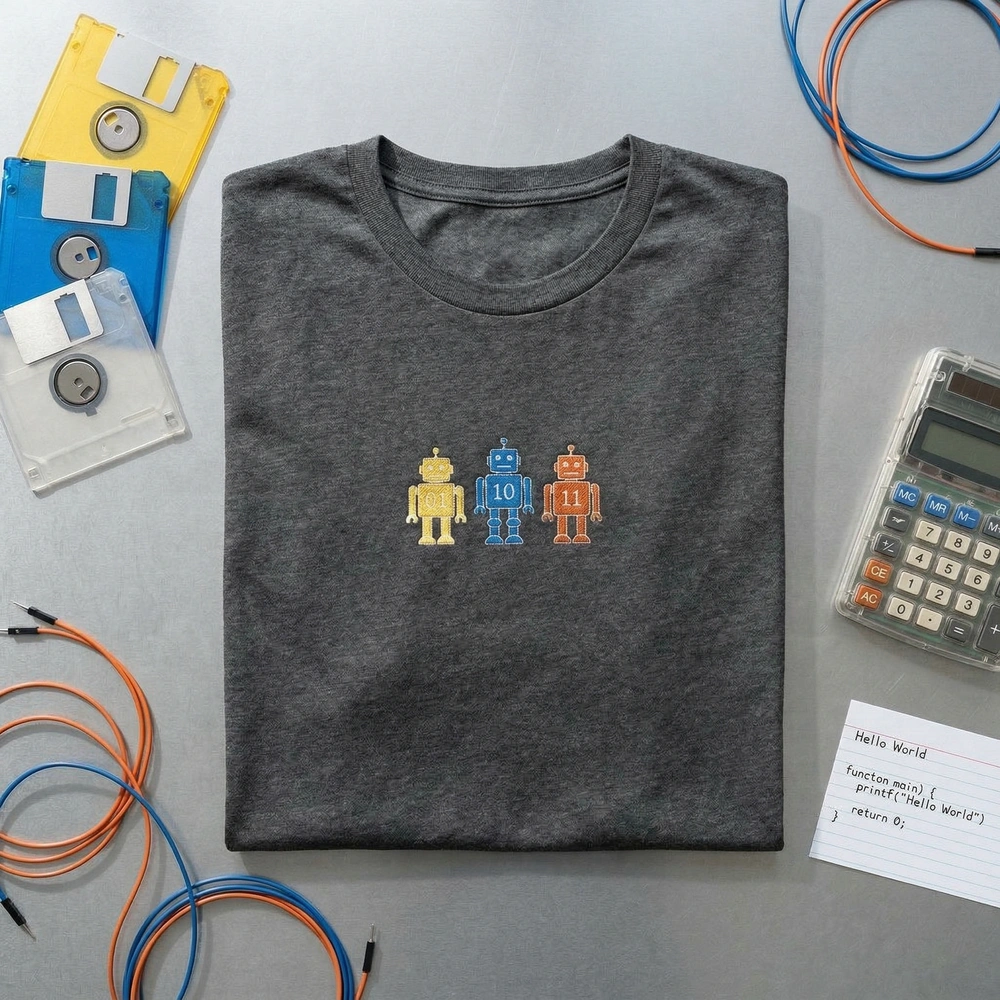 The Binary Bot Trio features three minimalist, flat-art robots standing side-by-side in a retro-futuristic style. The embroidery measures a substantial 24cm x 12cm, positioned perfectly across the chest. We use four vibrant, high-sheen thread colors: Sunflower Yellow (#FFD700) for Bot 01, Electric Blue (#0000FF) for Bot 10, and Burnt Orange (#CC5500) for Bot 11, all accented with crisp White Binary Outlines. The clean lines and lack of shading pay homage to early digital illustration techniques, ensuring a sharp, modern look on the deep black fabric.