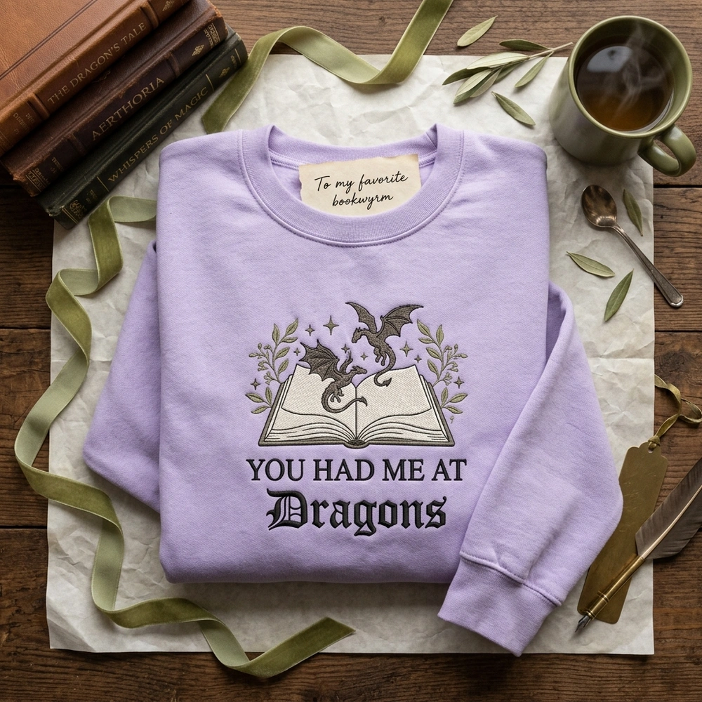 This design is meticulously crafted on a soft lavender (lilac) garment, providing a beautiful pastel backdrop for the intricate embroidery. The composition features a central open book with delicate sage green vines and leaves sprouting from the pages, symbolizing the growth found in literature. Hovering above are three detailed dragons in flight, rendered in a dark charcoal thread. Below the illustration, the phrase ‘YOU HAD ME AT Dragons’ is embroidered using a mix of modern sans-serif and bold gothic blackletter fonts. The design measures approximately 18cm x 20cm and uses 4 high-quality thread colors: Charcoal Grey, Sage Green, Cream White, and Black.