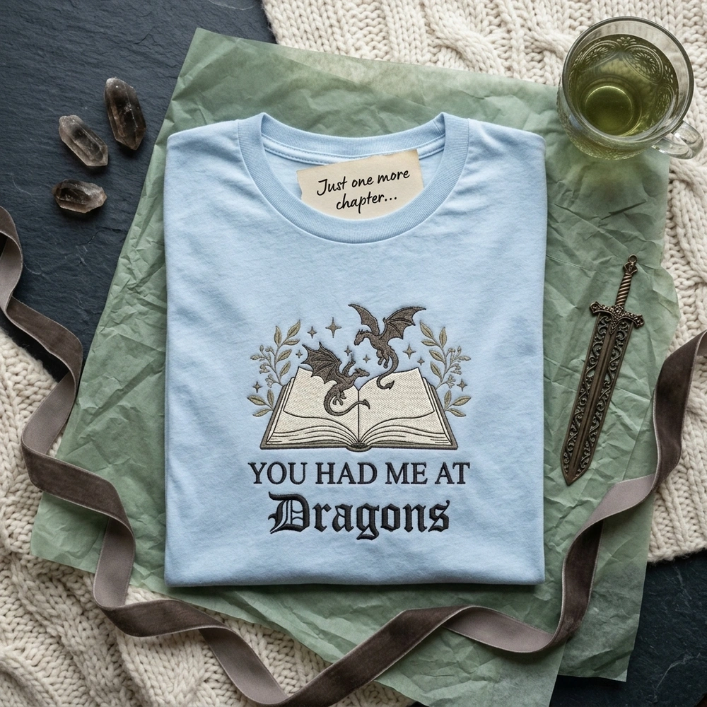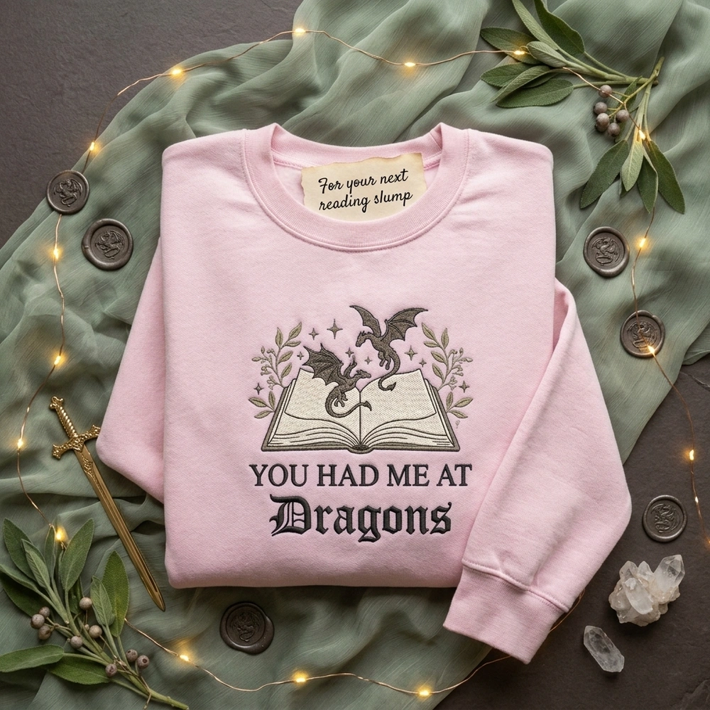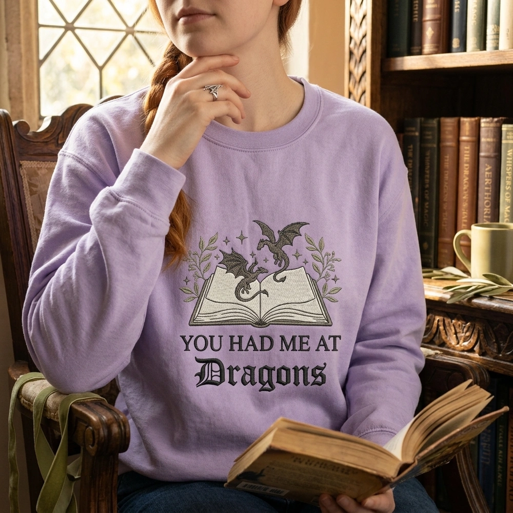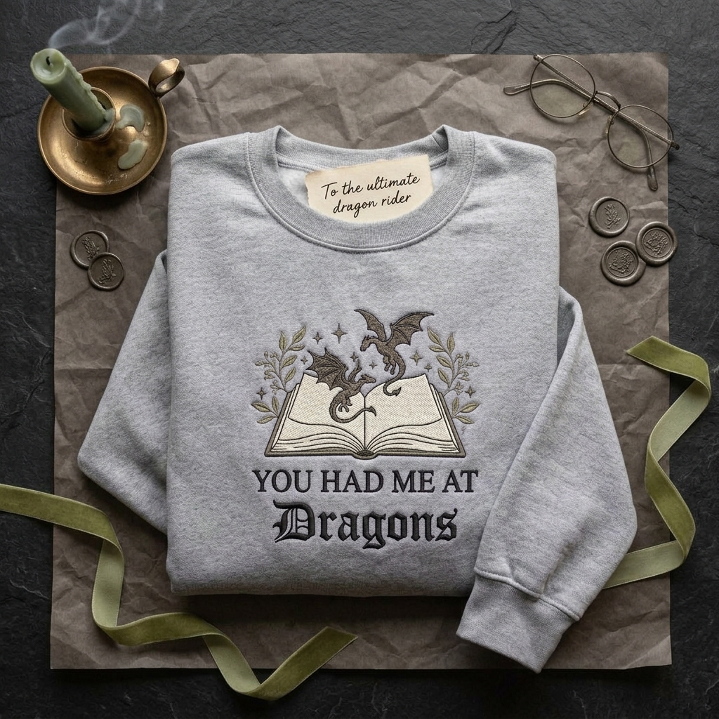 Celebrate your obsession with the legendary bond between rider and dragon with this aesthetic bookish apparel. Designed for those who spend their nights lost in the pages of epic fantasy, this sweatshirt captures the magic of a beloved dragon-filled universe without sacrificing style. Whether you are heading to a book club meeting or cozying up for a reading marathon, this high-quality piece is the ultimate statement for any fantasy reader. Browse more embroidered sweatshirts | bookish sweatshirt in our collection.
