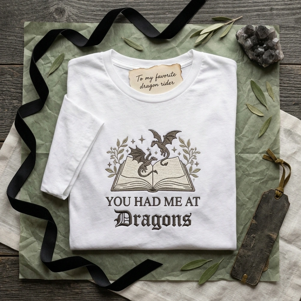 This design is inspired by the themes of popular modern fantasy literature, specifically stories involving dragon-riding academies, magical bonds, and epic adventures. It is a ‘discreet’ fandom design that looks like boutique apparel while nodding to your favorite bookish world.