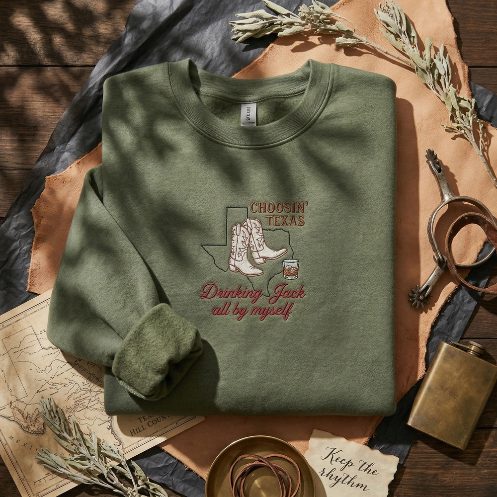Capture the raw, vintage 70s dive bar aesthetic with this custom-designed piece. Whether you are part of the ‘Ella’s Fellas’ club or just someone who appreciates the ‘drinking Jack all by myself’ vibe, this sweatshirt is the ultimate country concert gear. It is designed specifically for those who want stylish, wearable lyrics that stand out from generic tour merchandise. Browse more embroidered sweatshirts in our collection to find your perfect fit for the next Dandelion tour stop or a night at your local watering hole.