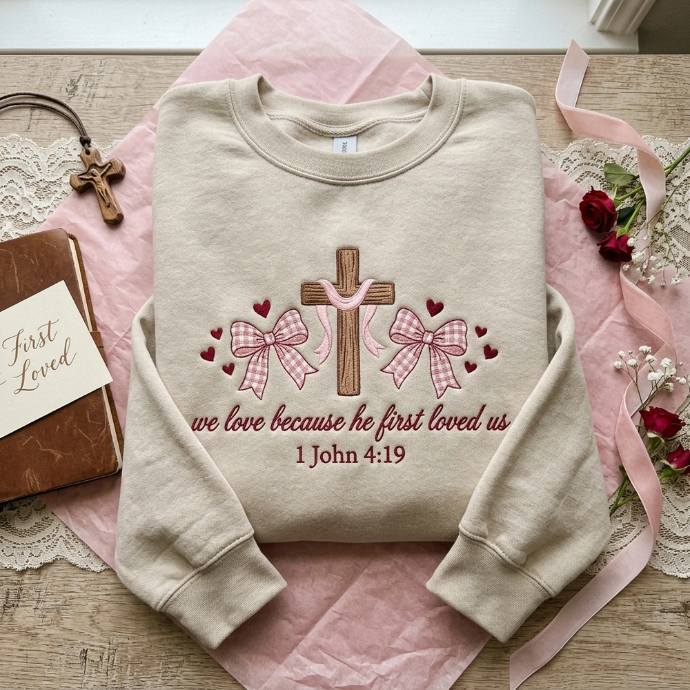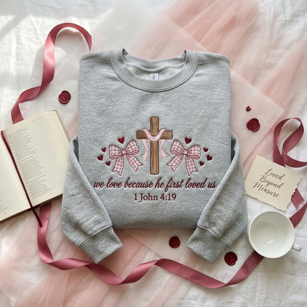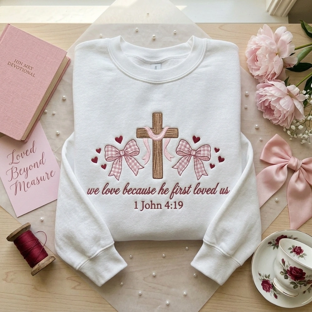 Beautifully blending the trendy coquette aesthetic with a profound message of divine love, this faith-based apparel is designed for Christian women, teen girls, and youth group members who want to wear their beliefs with grace. Featuring the powerful verse ‘we love because he first loved us’ (1 John 4:19), this cozy sand-colored crewneck serves as a daily reminder of God’s love while keeping you effortlessly stylish. Whether you are looking for a personalized Christian gift or a staple piece for your own wardrobe, this custom crewneck delivers unmatched boutique quality.