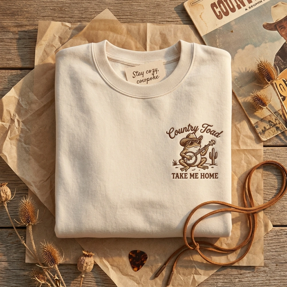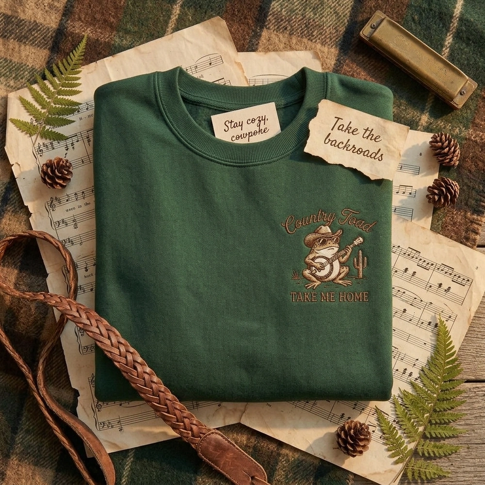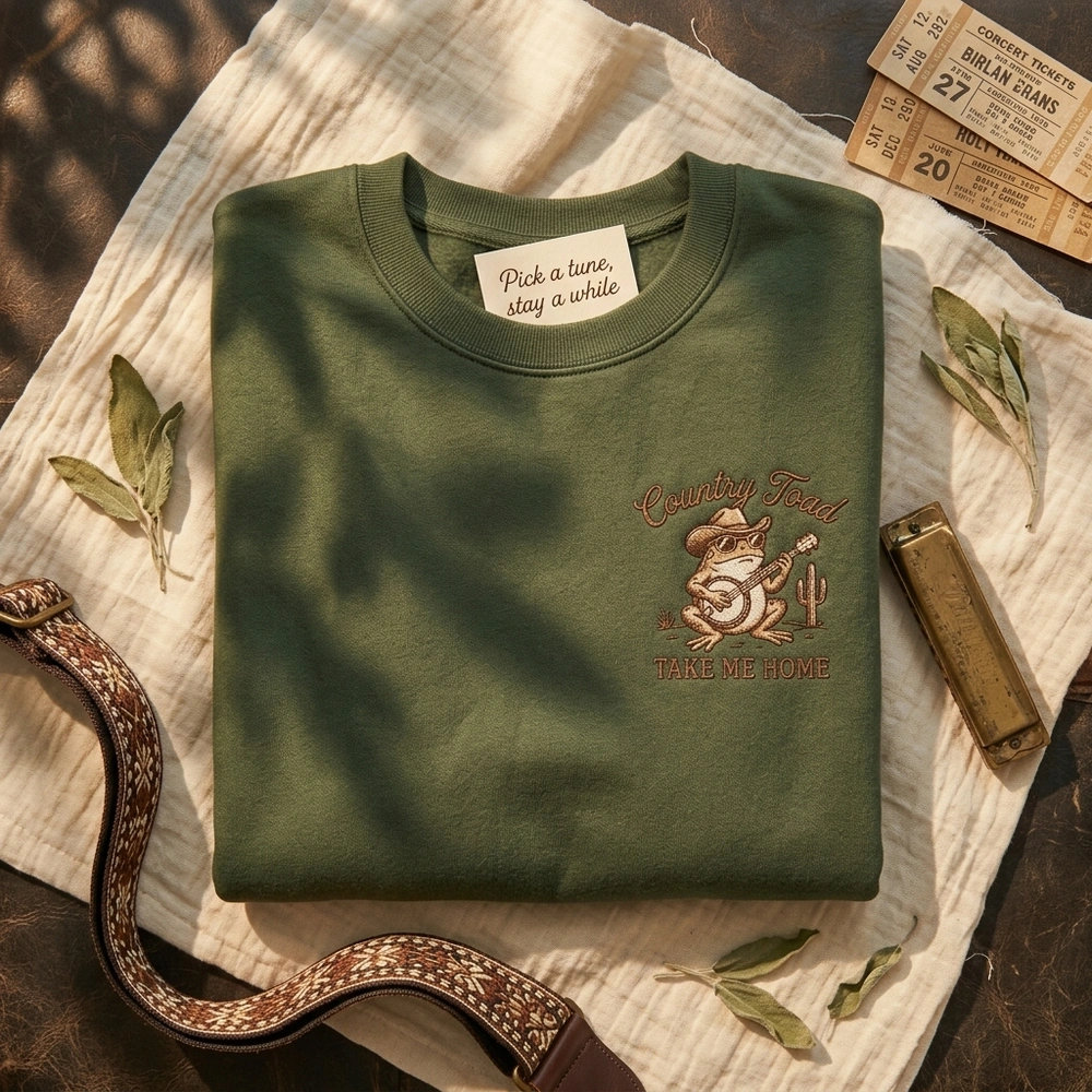 This unique piece of apparel perfectly blends nostalgic country music vibes with the playful ‘frogcore’ aesthetic, making it an instant conversation starter for any music lover. Whether you are heading to a festival or just lounging at home, this high-quality garment brings a touch of ironic humor and artisanal style to your wardrobe. Browse more embroidered sweatshirts | funny sweatshirt designs in our collection to find your next favorite look.