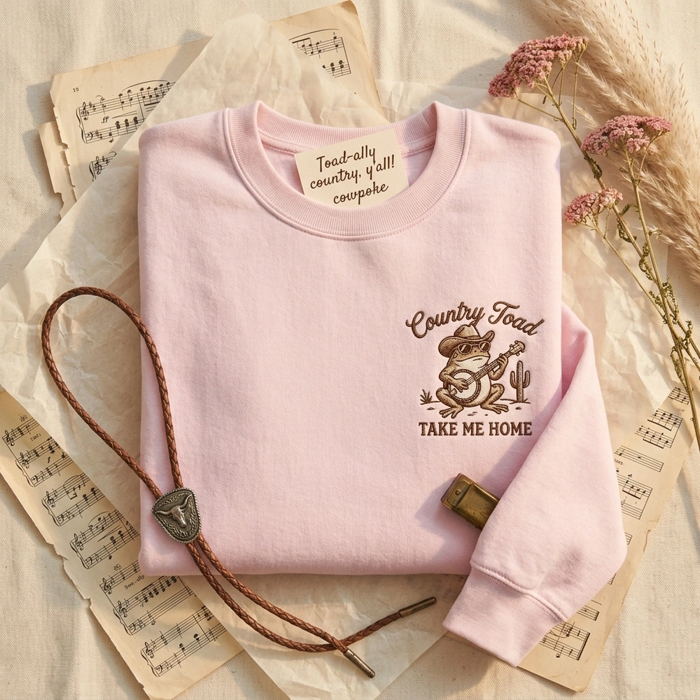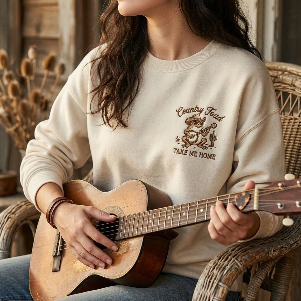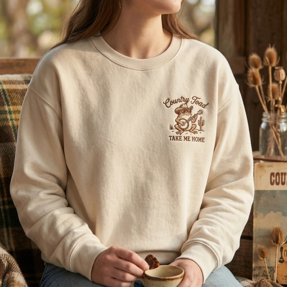 The Country Toad Take Me Home Embroidered Sweatshirt is a premium machine-stitched top featuring a whimsical banjo-playing frog in a western desert scene.
