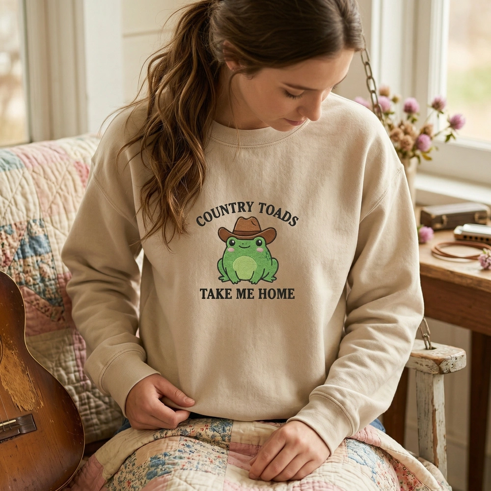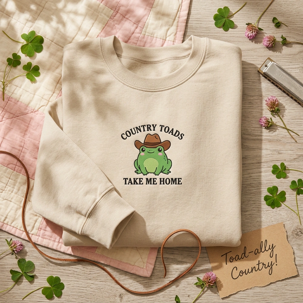 Bring a touch of whimsical nostalgia to your wardrobe with this charming cottagecore-inspired piece. Designed for frog lovers and country music enthusiasts alike, this sweatshirt blends a humorous pun with a high-quality aesthetic. Whether you are heading to a festival or cozying up at home, this sand-colored crewneck offers the perfect balance of comfort and personality. It’s an ideal choice for those who appreciate boutique-quality apparel that tells a story.