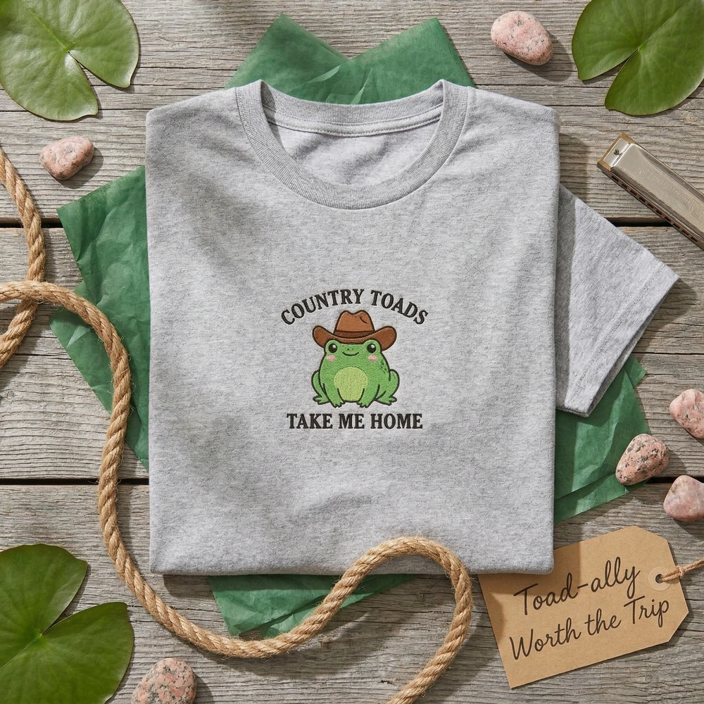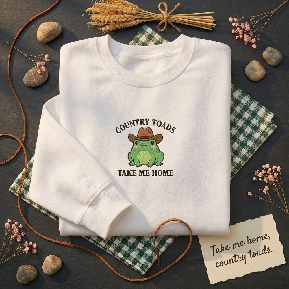 This embroidered sweatshirt is a thoughtful choice for frog and toad fans, country music lovers, cottagecore fashionistas, and anyone who loves a good pun. It makes a wonderful personalized birthday gift, a unique Christmas present, or a ‘just because’ treat for a best friend who loves western-themed kawaii art.