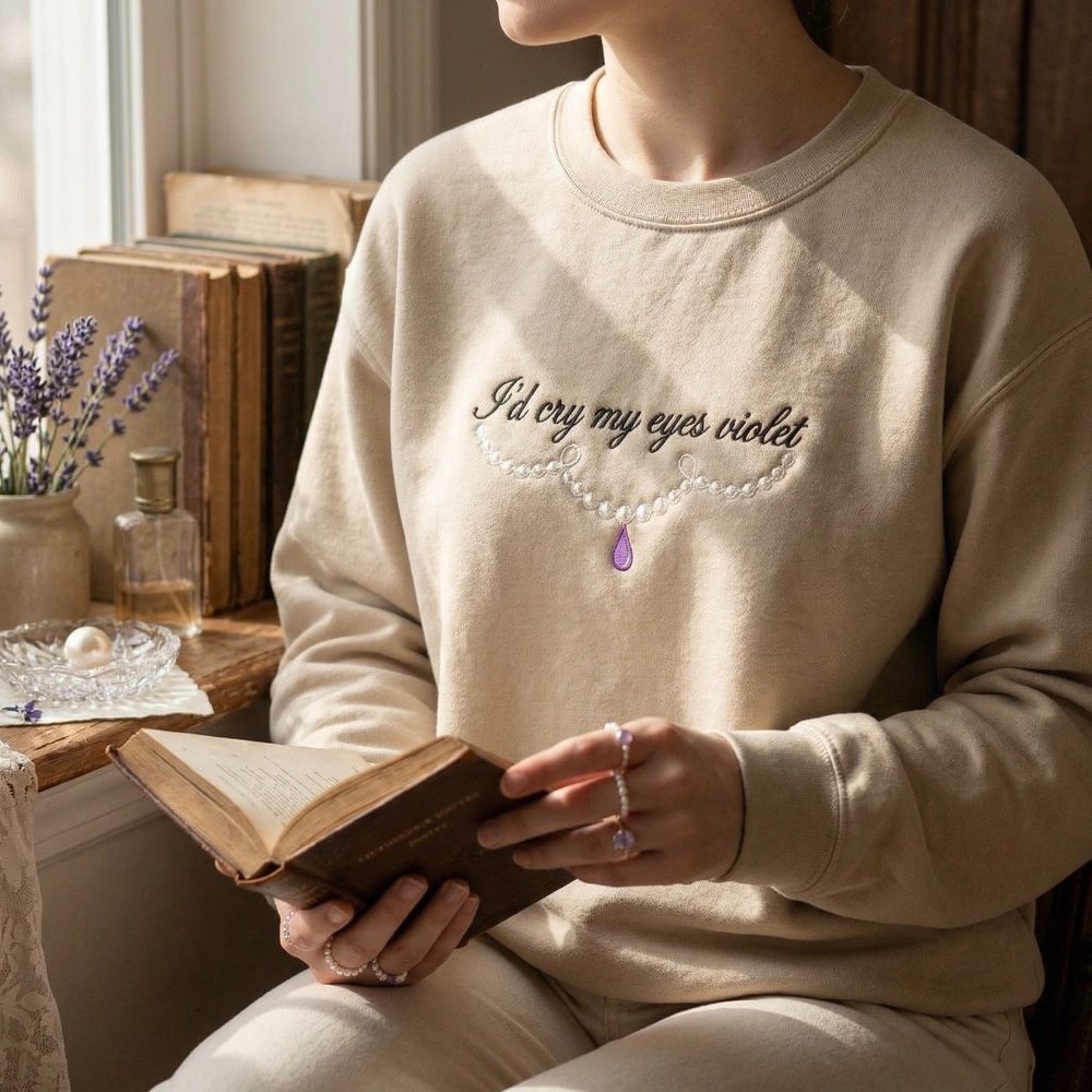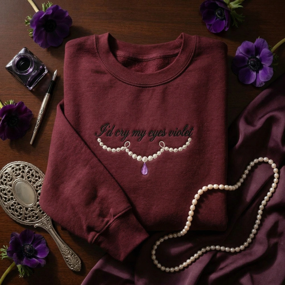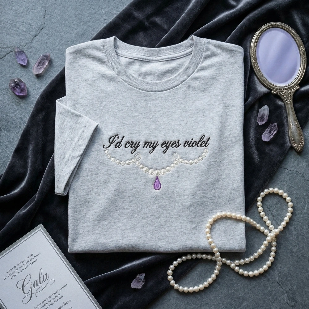 This V2 edition is meticulously machine-embroidered on a premium Sand-colored garment, providing a warm, neutral canvas for the high-contrast artistry. The focal point is the text “I’d cry my eyes violet” rendered in a large, legible retro script using deep black thread. Below the lyric, a stylized, continuous-line illustration of a pearl necklace loops elegantly, featuring vibrant violet teardrop and shimmering pearl-white highlights. The embroidery measures approximately 18cm x 15cm and utilizes three distinct premium thread colors for a high-end, textured finish that won’t fade.