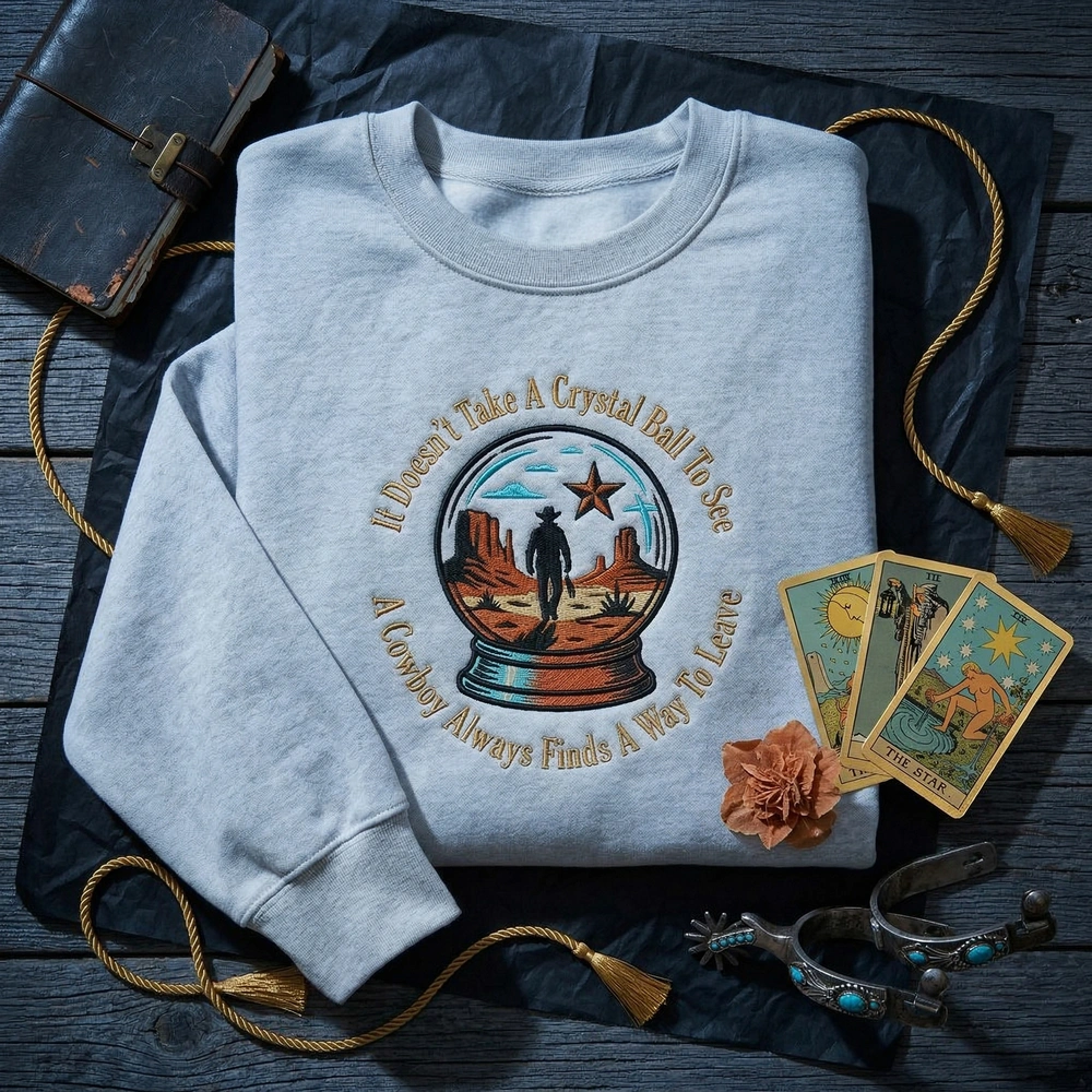 The Western Graphic Tee Embroidered Sweatshirt features a vintage mystic crystal ball design, capturing the heartbreak of the cowboy always finds a way to leave merch aesthetic.