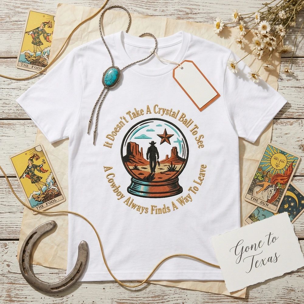 This premium Sand-colored garment serves as the perfect canvas for our intricate 20cm x 20cm embroidery. The design features a high-density stitch count using five distinct thread colors: #000000 Black, #FFFFFF White, #CC5500 Burnt Orange, #40E0D0 Turquoise, and #D4AF37 Metallic Gold. The central glass sphere reveals a dusty desert scene with a lone cowboy walking toward a Texas lone star, framed by organic, retro-western typography. Every stitch is placed with precision to ensure a vintage look that lasts.