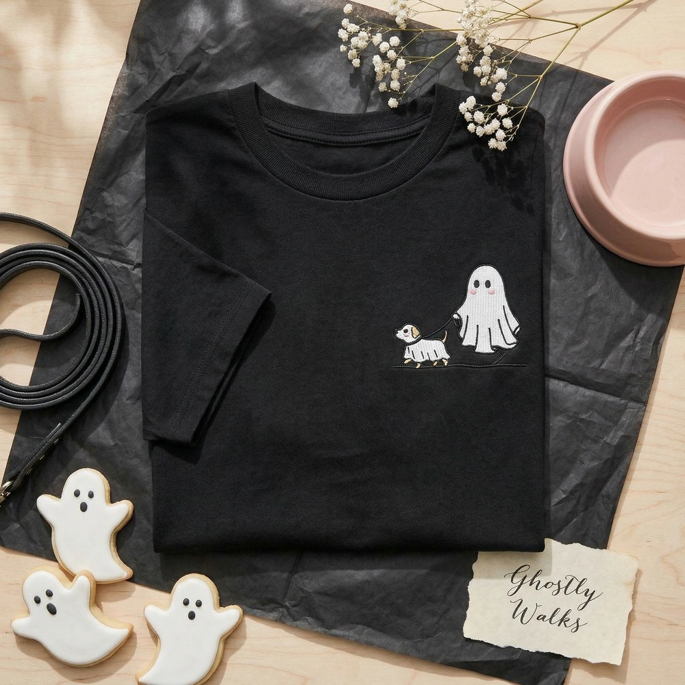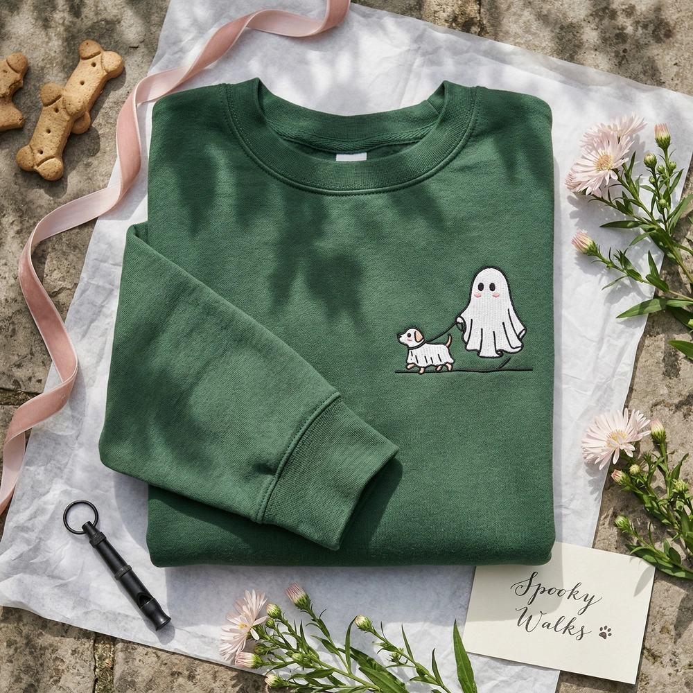 The “Dog Walker Ghost V1” design is a masterpiece of minimalist humor. Located on the left chest, the embroidery measures approximately 10cm x 8cm, making it subtle yet highly visual. We use three distinct thread colors to bring this scene to life: #FFFFFF Ghost White for the classic sheet silhouettes, #000000 Outline Black for crisp definition, and a touch of #FFB6C1 Blush Pink for the tiny, adorable cheeks. The high-density satin stitching ensures the white thread pops beautifully against the deep Forest Green fabric.