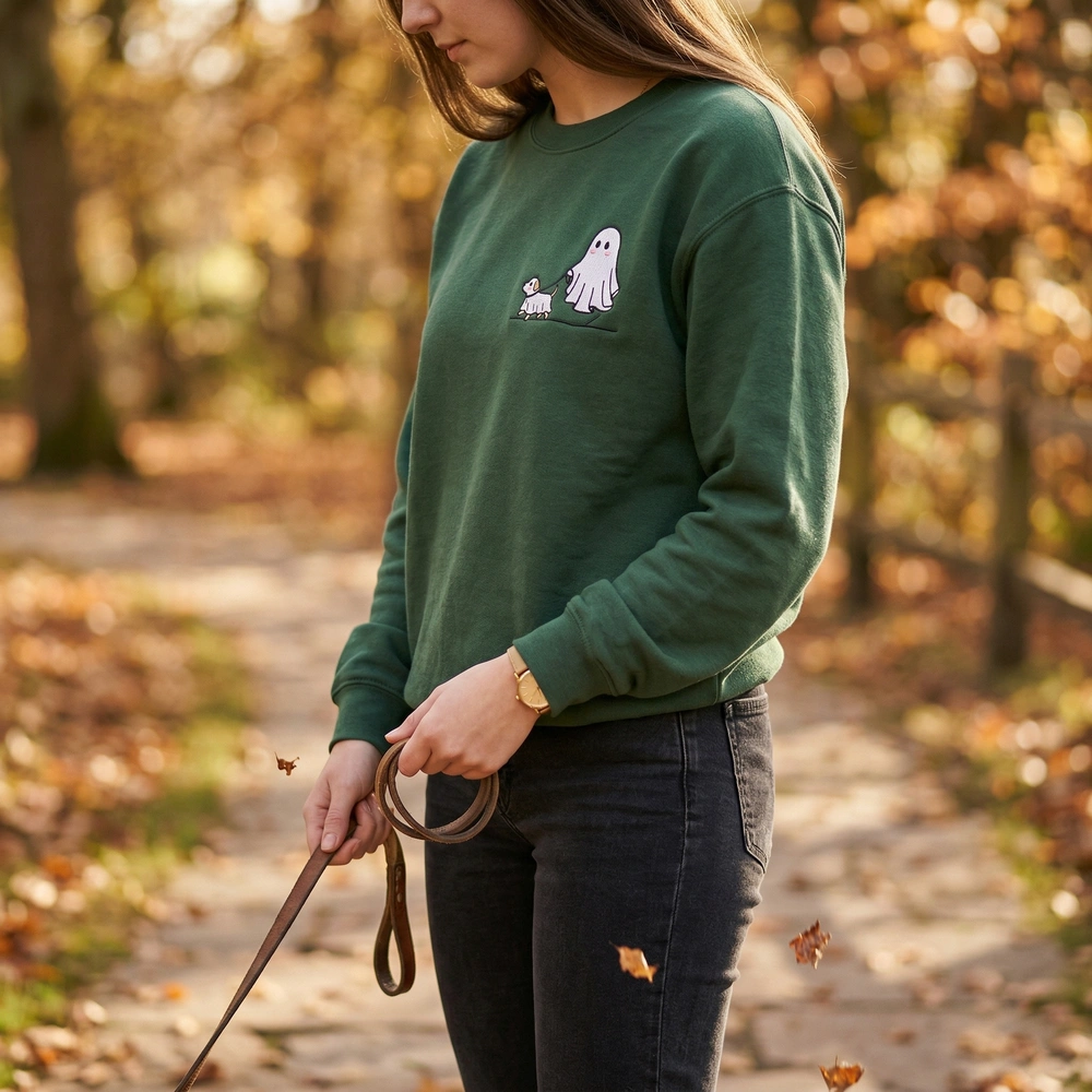 Lollidollyart Dog Walker Ghost Embroidered Sweatshirt – Forest Green Personalized Spooky Gift