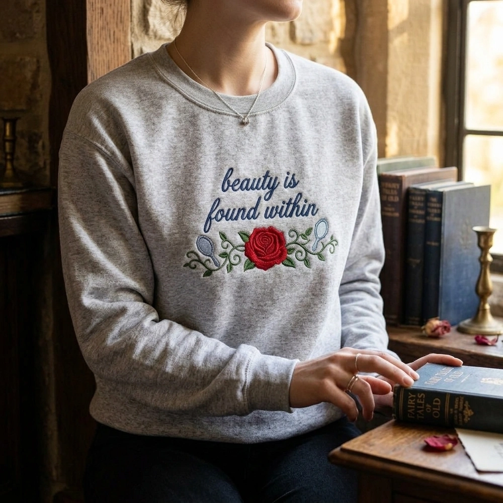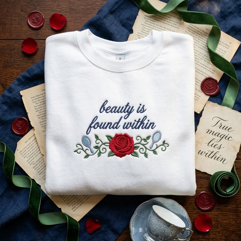 The Beauty Is Found Within Embroidered Sweatshirt is a premium machine-embroidered top featuring a romantic enchanted rose and an inspiring fairy tale quote.