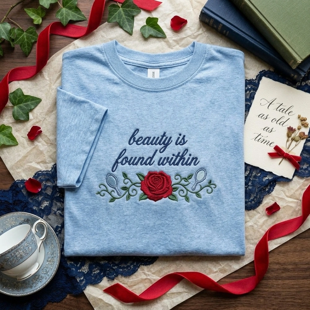 This exquisite design is centered on the chest, spanning approximately 25cm to create a balanced, horizontal layout. The centerpiece is the iconic phrase “beauty is found within,” rendered in a flowing navy blue cursive script using a raised satin stitch for a premium, textured feel. Below the text, a vibrant red rose is brought to life with a dense fill stitch, giving the petals a plush, dimensional appearance. The design is framed by winding forest green vines and delicate leaves in a precise running stitch. To complete the magical aesthetic, tiny falling red petals and miniature hand mirrors are stitched in a shimmering silver-blue thread, providing a subtle sheen against the Sport Grey fabric.