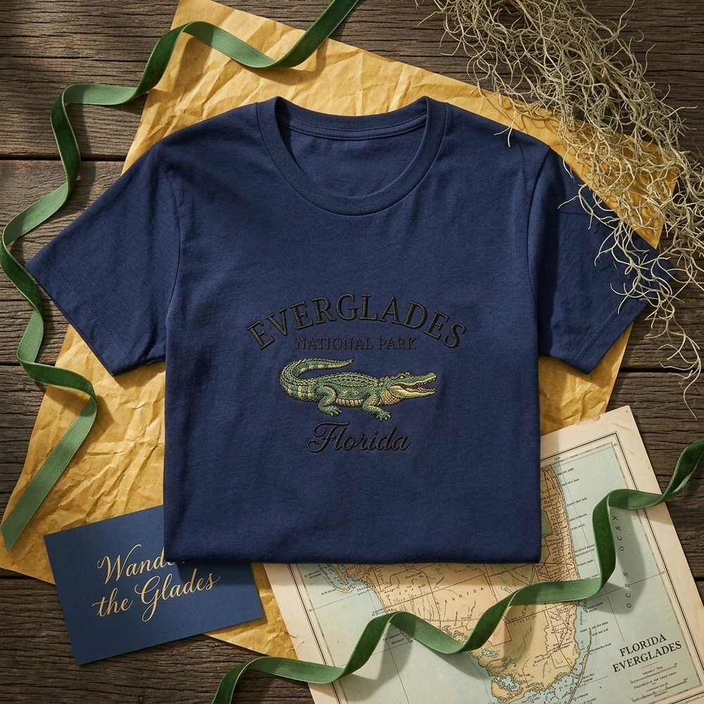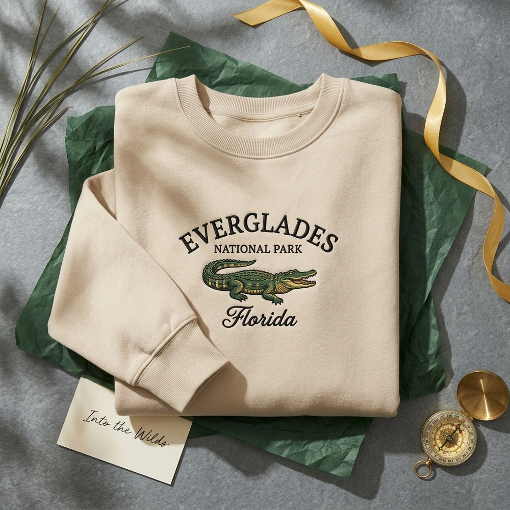 This design is a masterclass in texture and color, featuring a classic souvenir composition. The word “EVERGLADES” is arched across the chest in a bold, black satin stitch, providing a raised, professional finish. Beneath it, the “NATIONAL PARK” subtext and an elegant “Florida” script frame a stunningly detailed alligator graphic. The gator is rendered in five thread colors: Forest Green for the body, Gold for the underbelly, and Soft Pink for the open mouth, with black running stitches defining the scales. Set against the neutral Sand garment color, this 18cm x 14cm embroidery offers a premium feel far superior to standard screen printing.