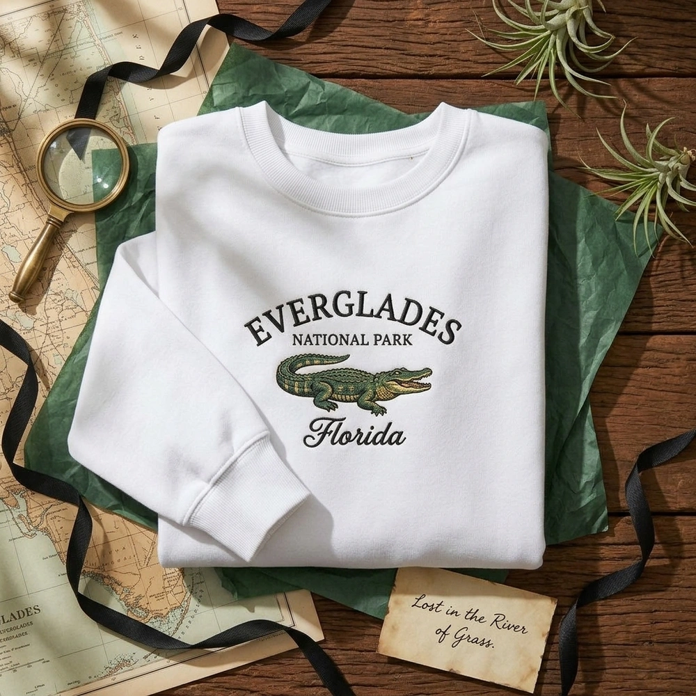 The Everglades Sweatshirt is a premium machine-embroidered souvenir featuring a detailed Florida alligator—perfect for nature lovers and park fans.