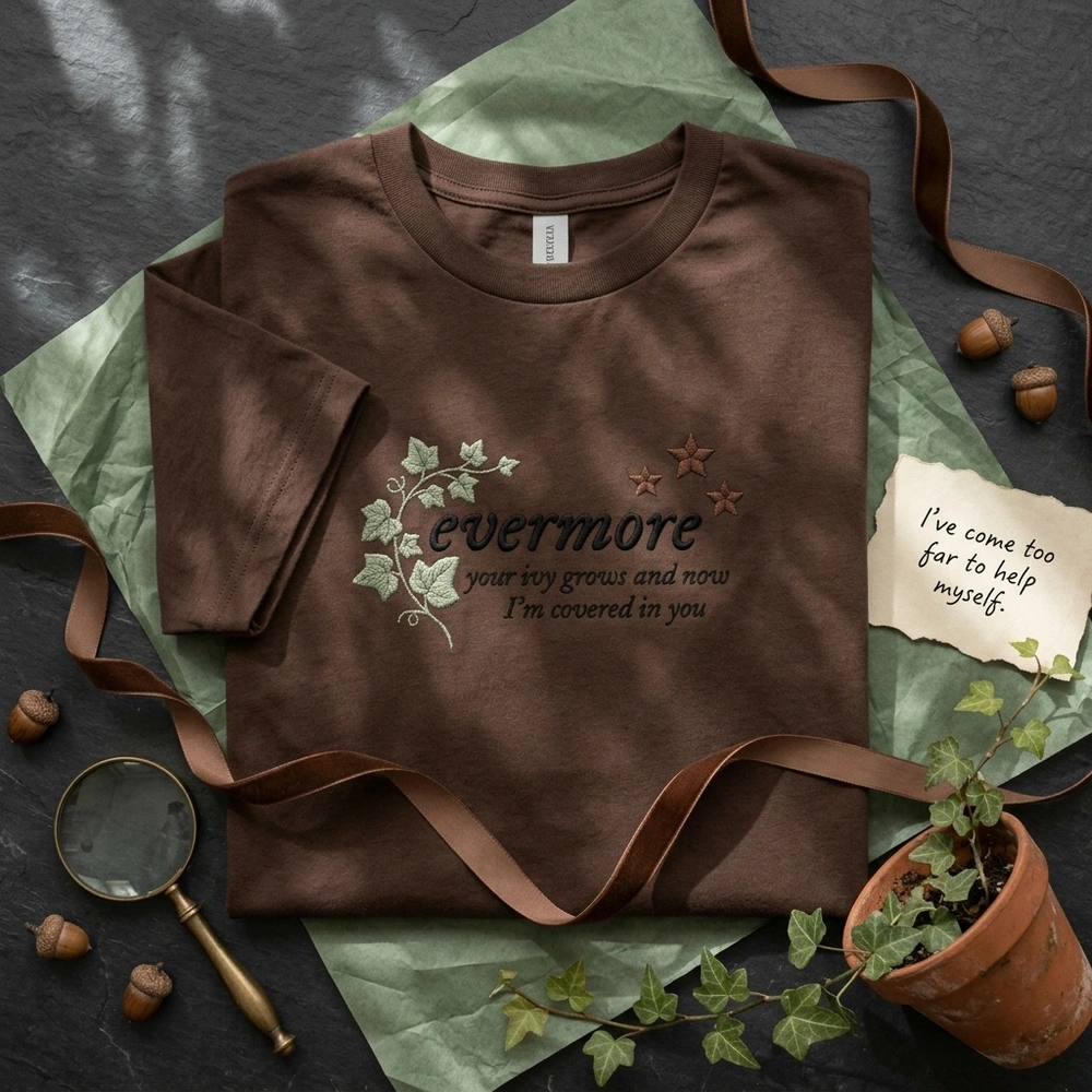 This exclusive design is meticulously crafted on a soft Sand-colored garment, providing a warm, neutral canvas for the earthy thread palette. The center features a bold, elegant serif title in a dense black satin stitch, creating a premium raised texture. Flowing below is the evocative lyric “your ivy grows and now I’m covered in you” in a delicate running stitch. A sweeping ivy branch, detailed with sage green outlines and light green leaves, anchors the composition, while three chocolate brown stars add a celestial touch. The entire embroidery measures approximately 20cm x 15cm, ensuring a high-impact look that maintains a minimalist, handcrafted feel.