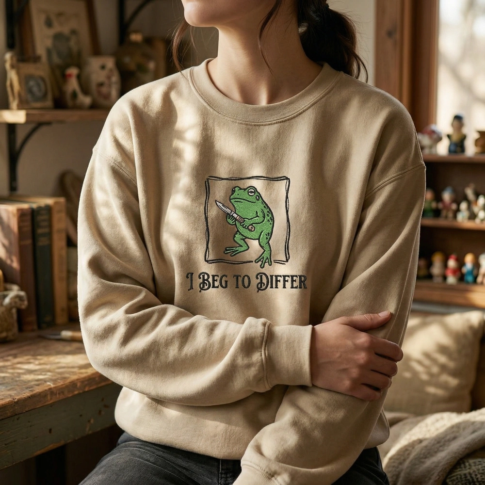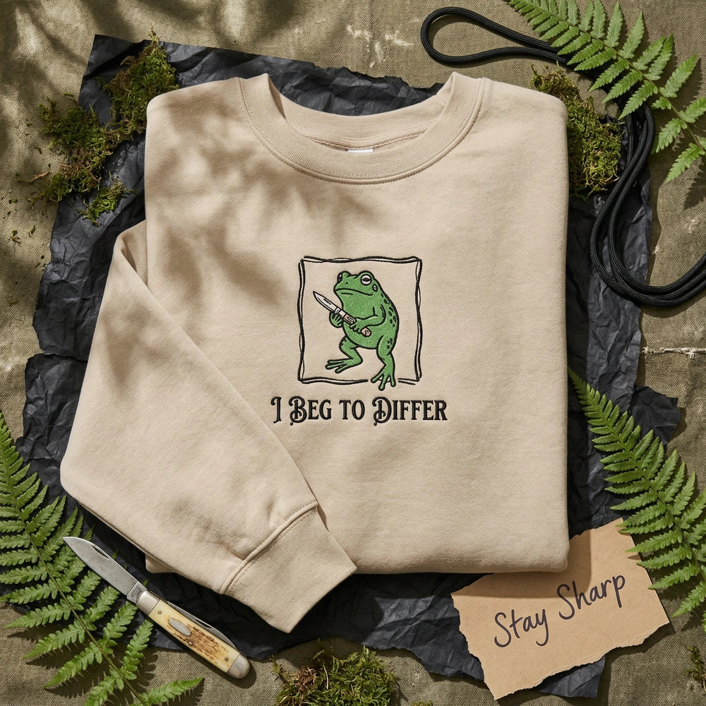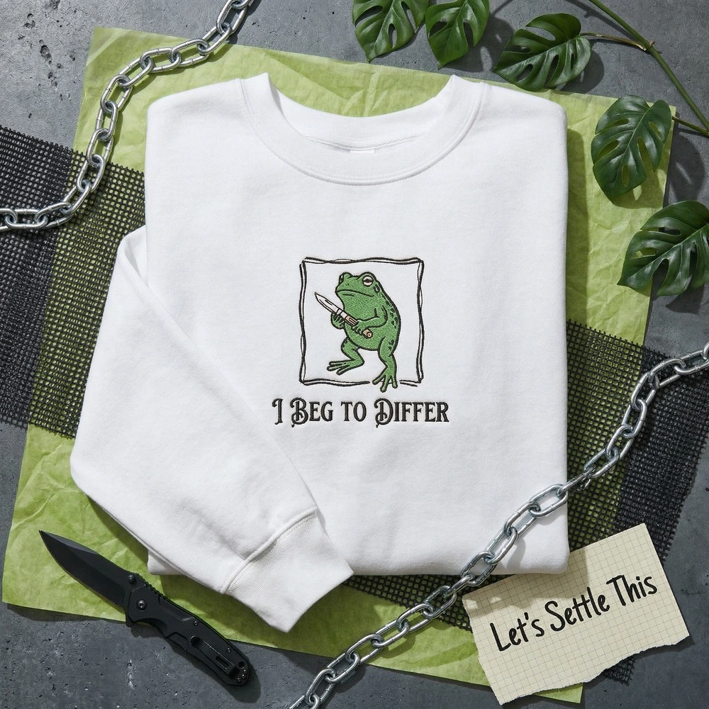 The funny frog sweatshirt is a premium machine-embroidered garment featuring an unhinged frog with a knife and ‘I Beg To Differ’ text—perfect for chaos frog fans.