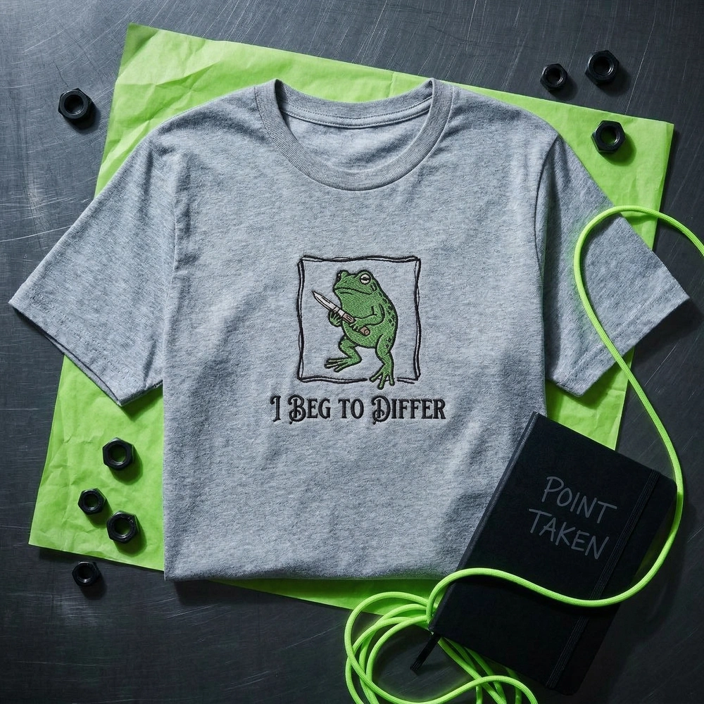 This design is expertly crafted on a Sand-colored garment, providing a neutral backdrop that makes the vibrant embroidery pop. The artwork features a stylized green frog standing defiantly within a hand-drawn black square frame. We use a vibrant green tatami fill for the body with a clever offset shadow effect that mimics a vintage misregistered screen print. Bold black satin stitch outlines define the frog’s form and the small knife, while scattered running stitches provide gritty, textured shading. The ‘I BEG TO DIFFER’ text is rendered in a dense, classic serif font. The embroidery measures approximately 12cm x 14cm and utilizes two high-quality thread colors (Black and Vibrant Green) for a clean, illustrative finish.
