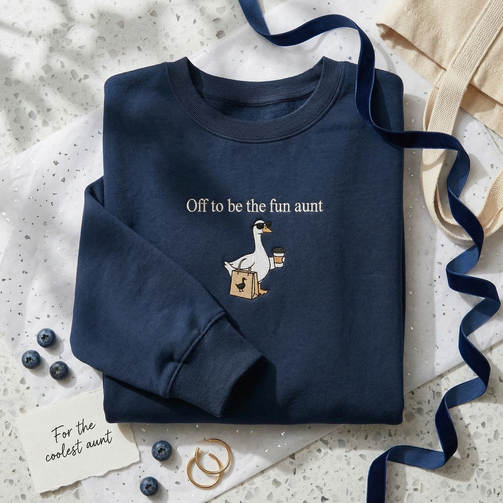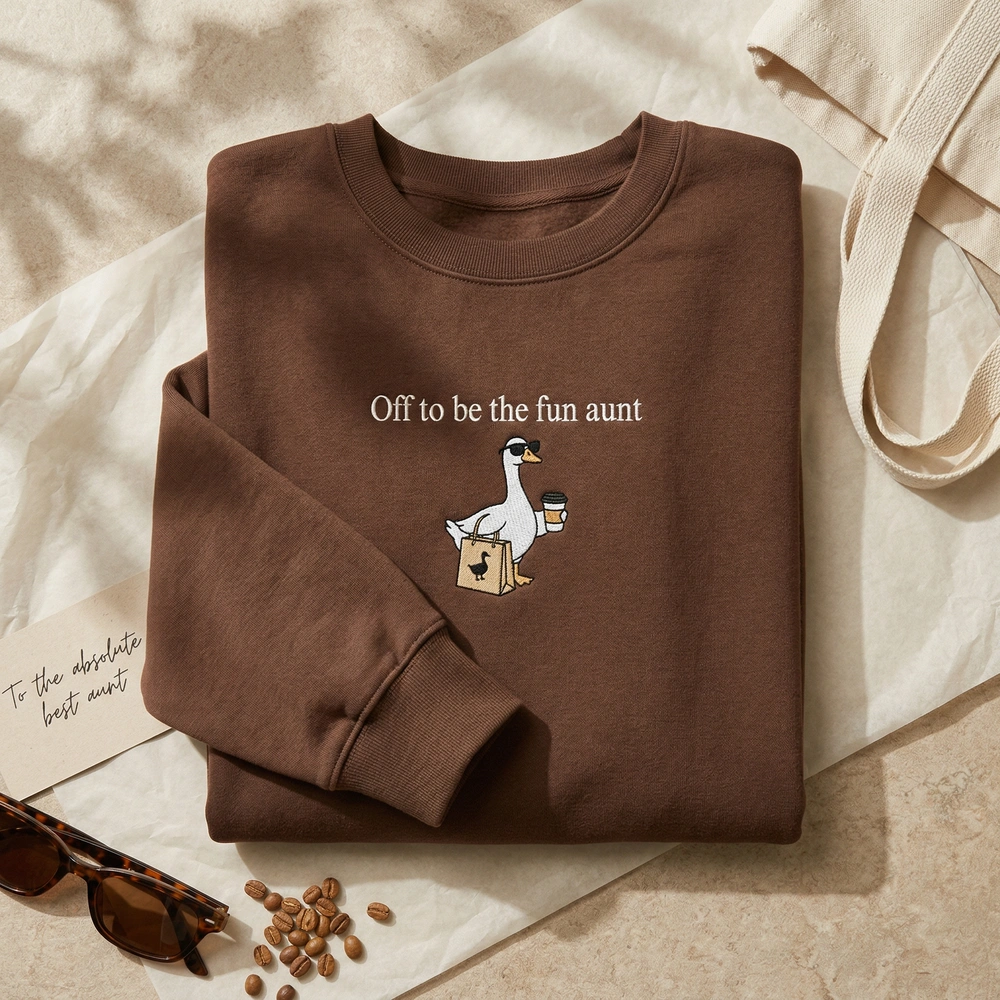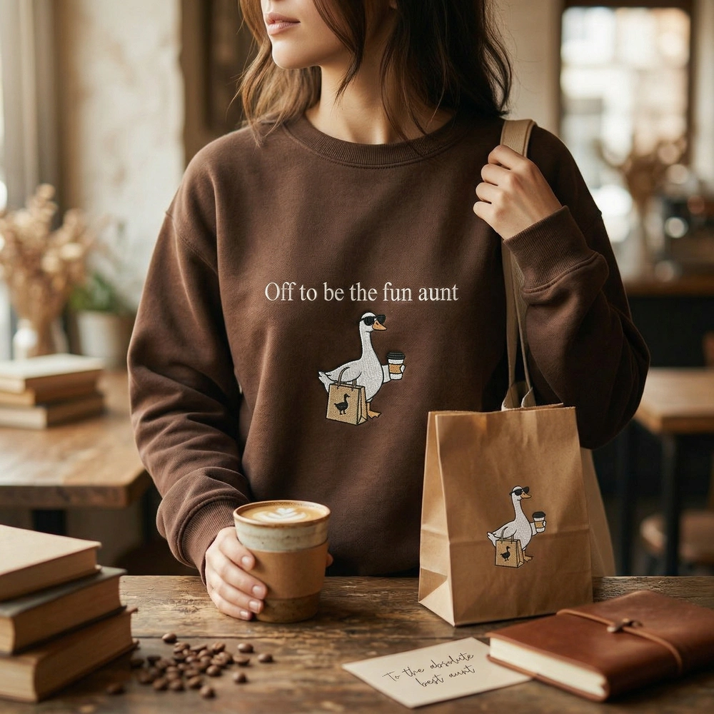 This exclusive design features a confident cartoon white goose wearing black sunglasses, carrying a light brown paper shopping bag and a coffee cup. Above the character, the phrase ‘Off to be the fun aunt’ is arched in a classic, elegant white serif font. Our embroidery process uses a clean satin stitch for the text to ensure maximum legibility and a luxurious sheen. The goose’s body is rendered in a solid white fill stitch, outlined with a crisp black running stitch for sharp definition. The accessories utilize a minimal palette of Golden Tan and Light Brown, keeping the design modern and visually impactful. The embroidery measures approximately 15cm x 12cm and is centered on the chest for a prominent, stylish look.