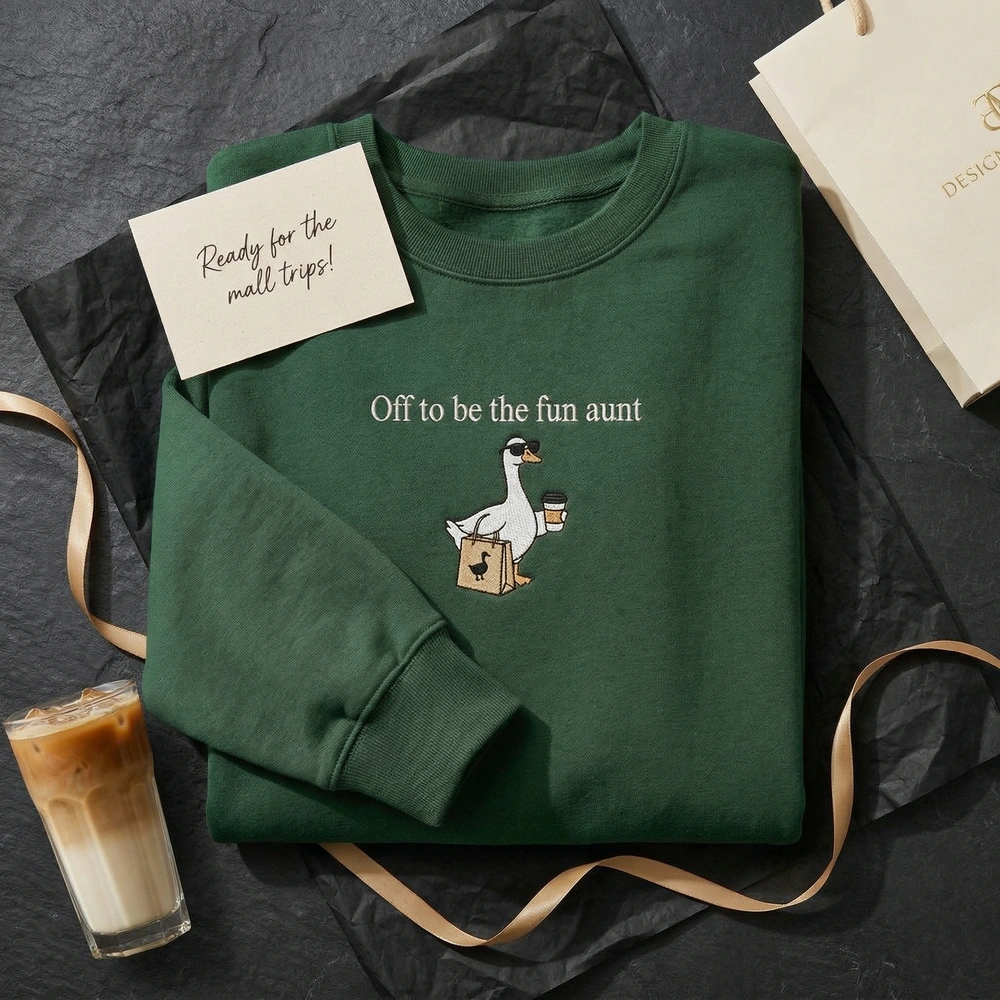 Celebrate the ‘fun aunt’ energy with this charming and humorous piece of custom apparel. Designed for the aunt who is always on the go—coffee in one hand, shopping bag in the other—this sweatshirt captures a relatable, trendy aesthetic that stands out. Whether you are treating yourself or looking for a unique pregnancy announcement gift for a sister, this high-quality embroidered garment offers a level of sophistication and durability that standard printed shirts simply cannot match.
