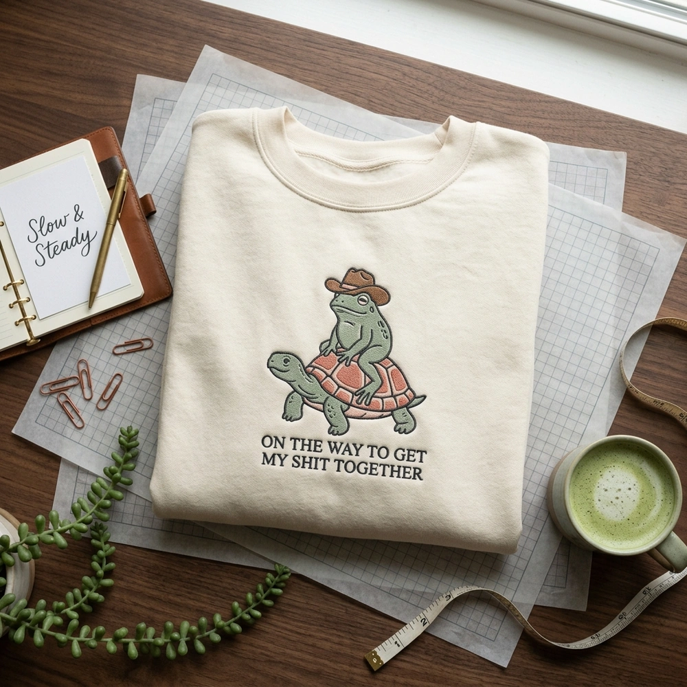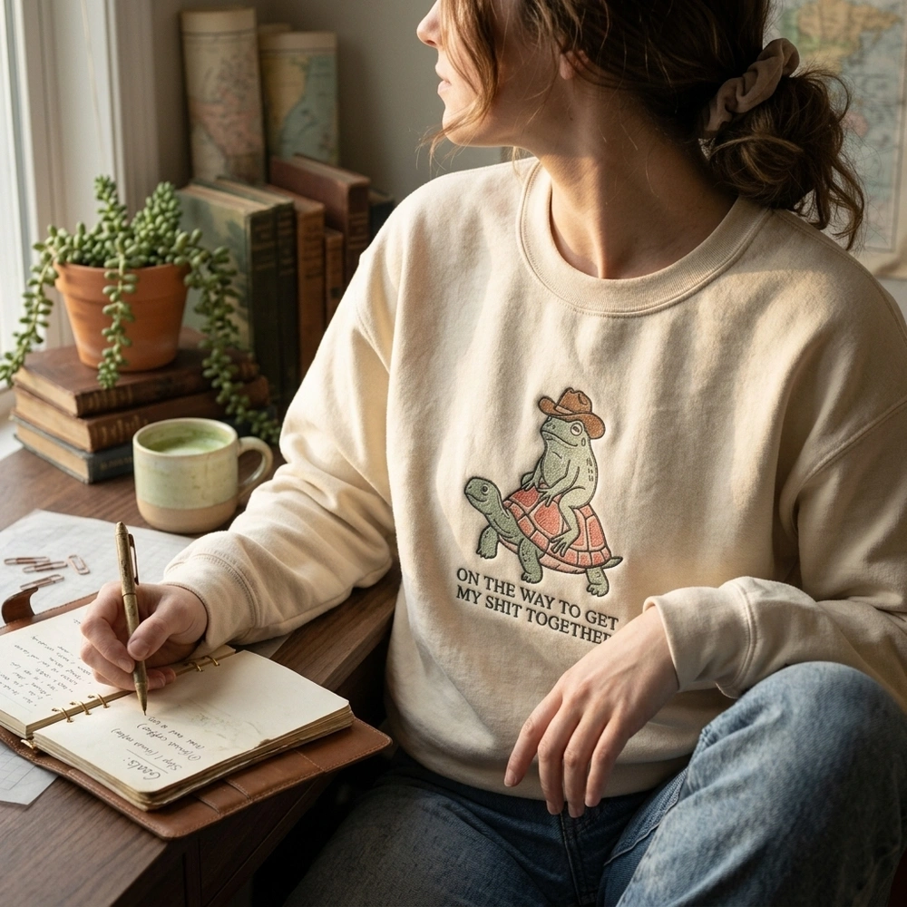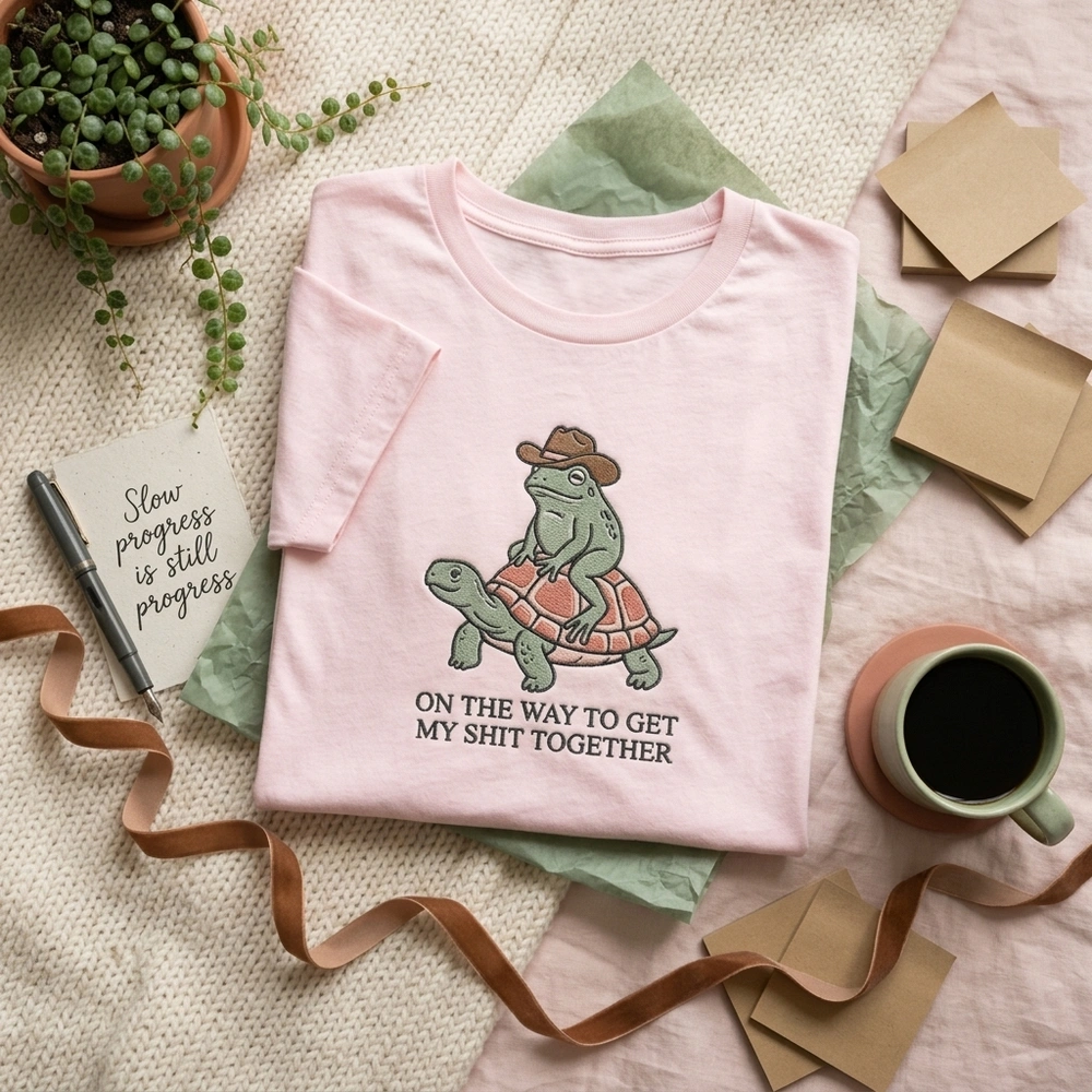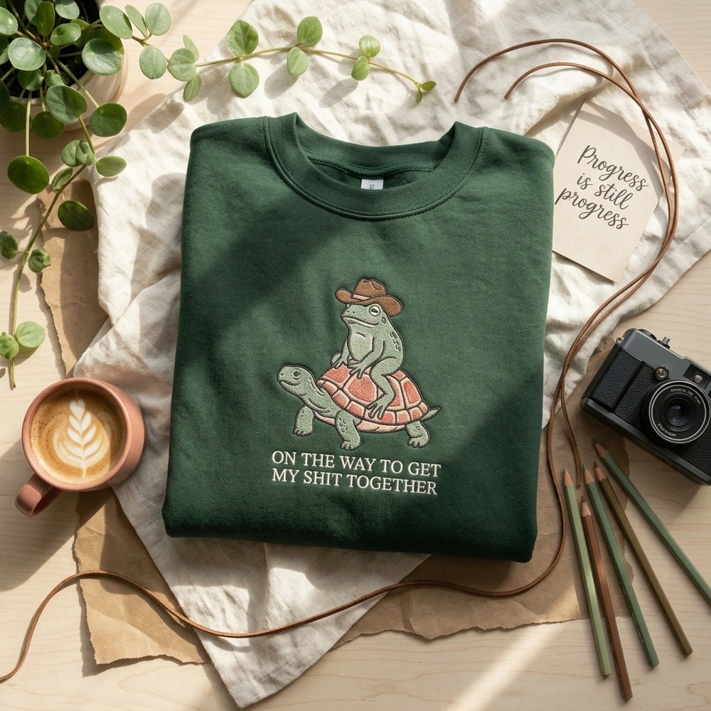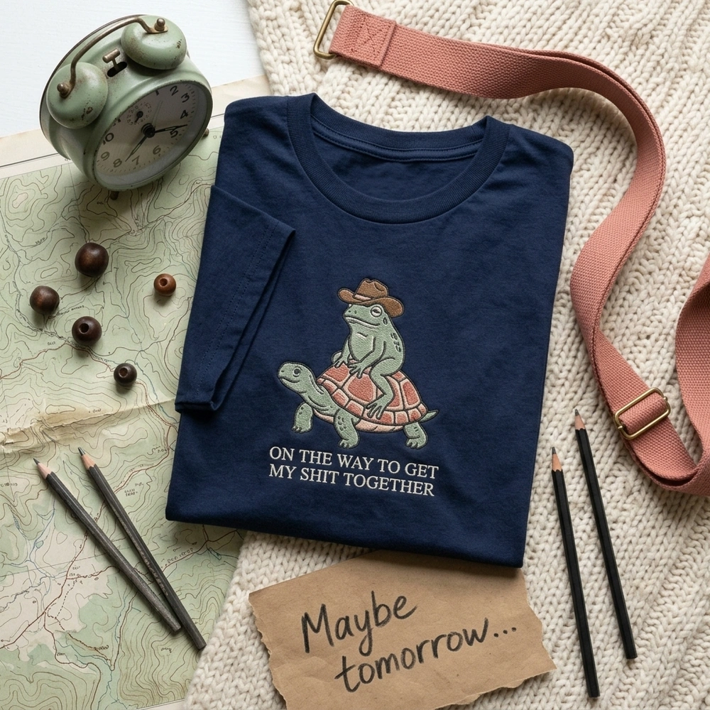 Embrace the slow, deliberate journey of adulting with this hilarious, ironic apparel piece. Designed for young adults, college students, and proud procrastinators, this vintage-style animal illustration perfectly captures the struggle of personal growth. The stoic cowboy frog riding a slow-moving turtle reminds us all that as long as we are “on the way to get my shit together,” the speed doesn’t matter. It serves as the ultimate relatable mental health humor gift for friends, siblings, or yourself.