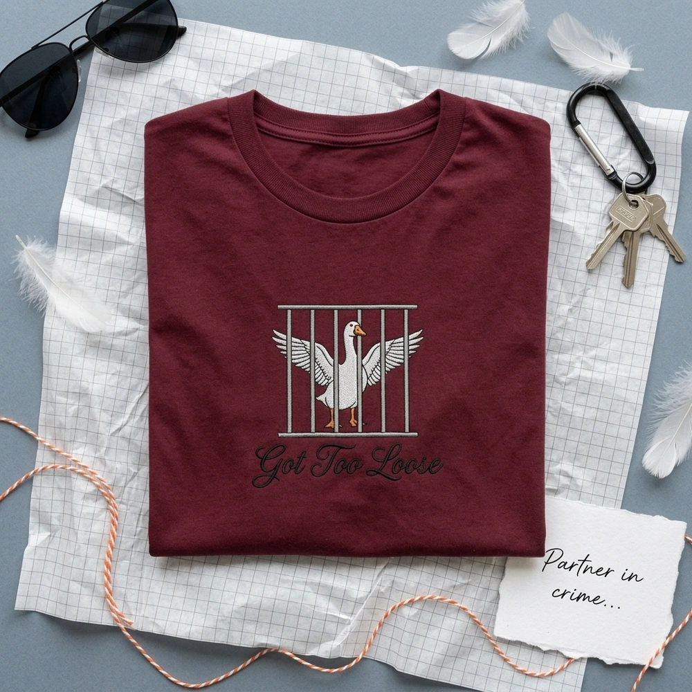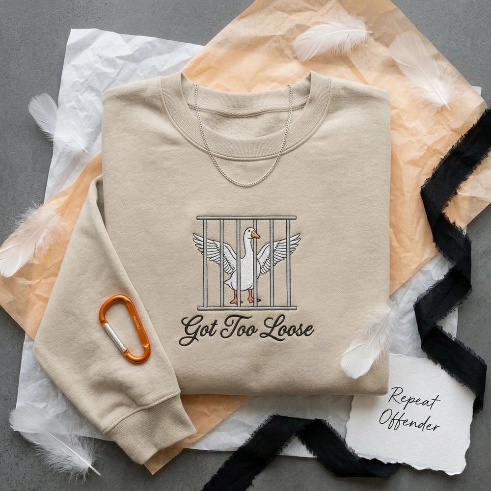 This design is a playful nod to the popular “Silly Goose” internet meme and the slang term “getting loose” (acting wild or partying). It humorously suggests that the goose’s antics finally landed it in “bird jail,” making it a staple of ironic animal humor.