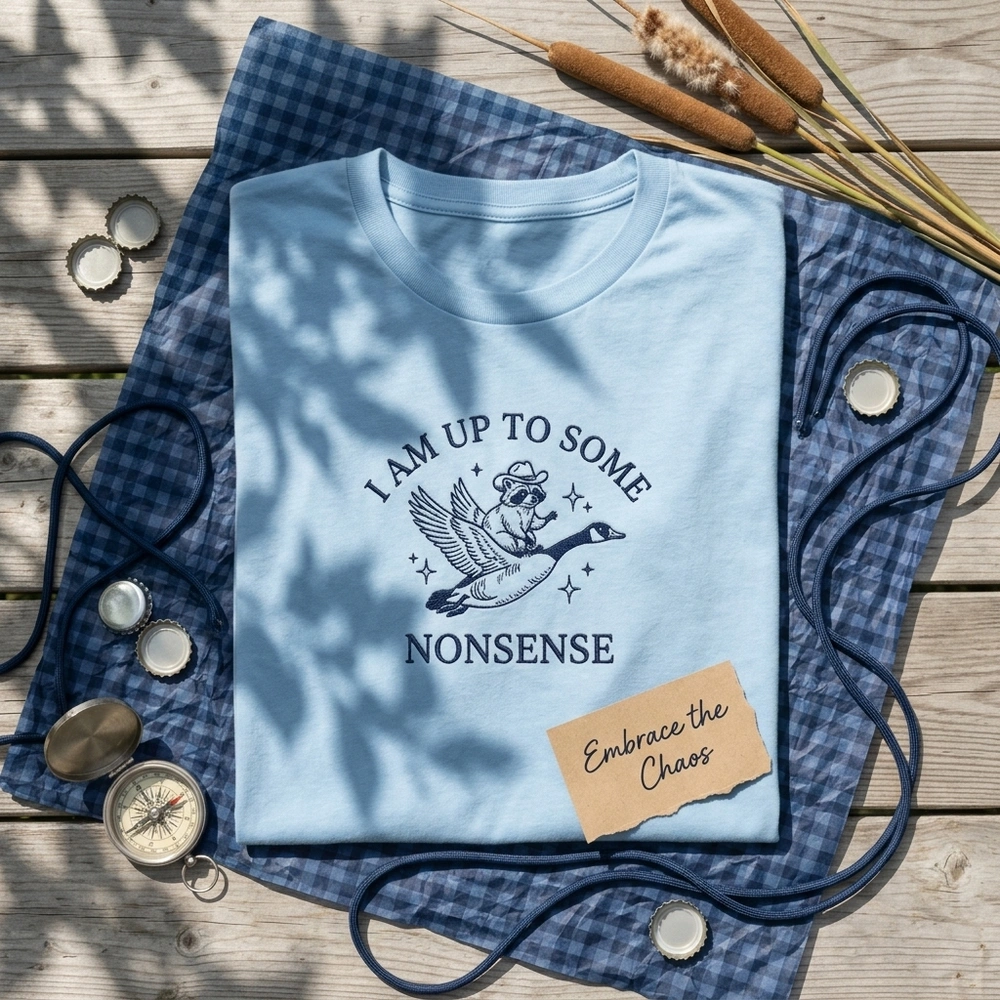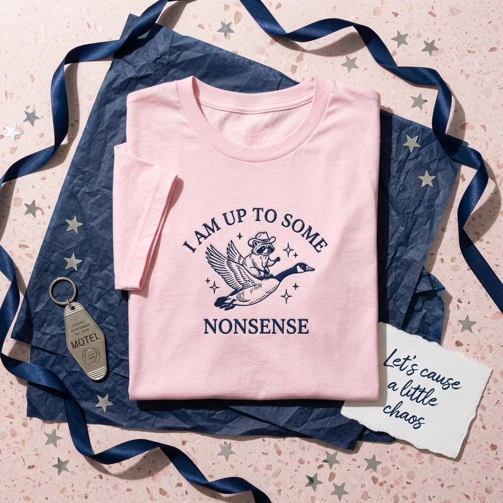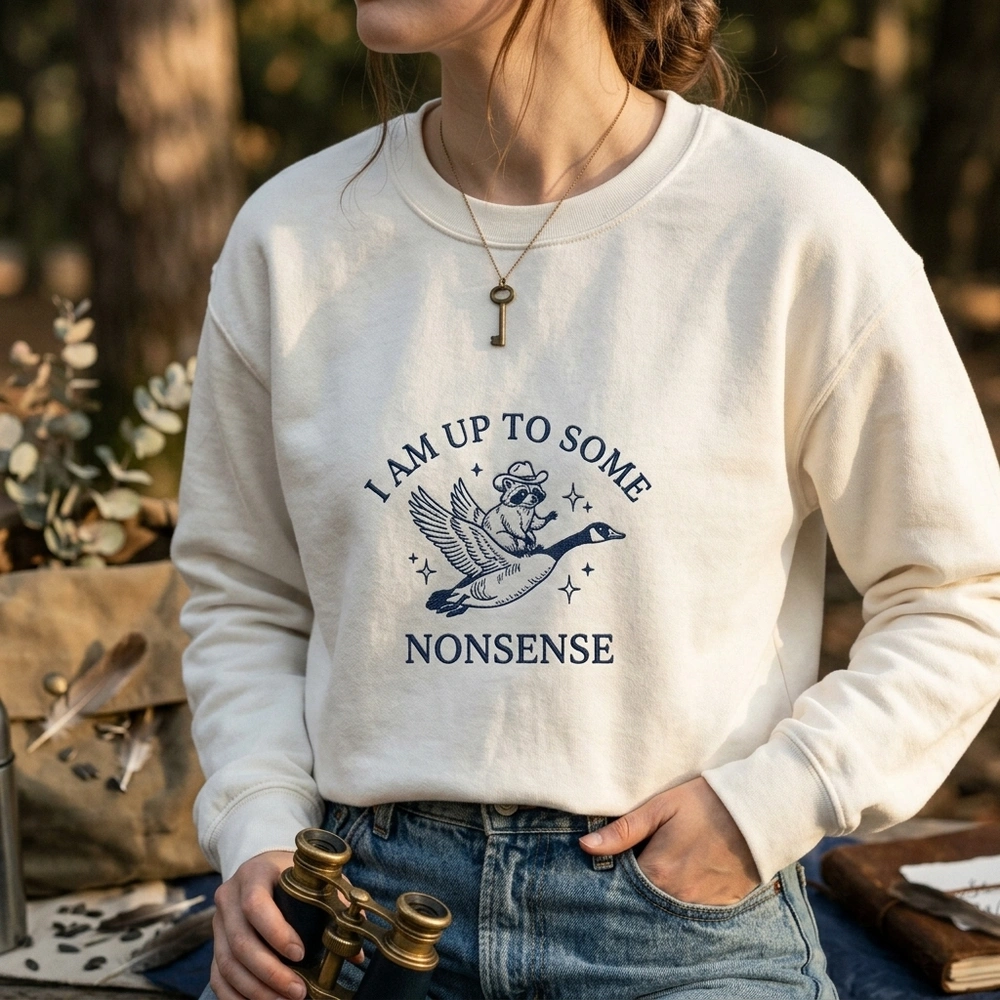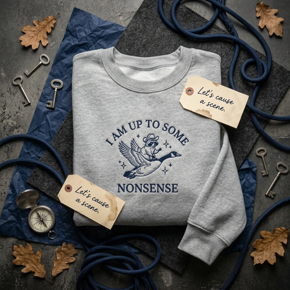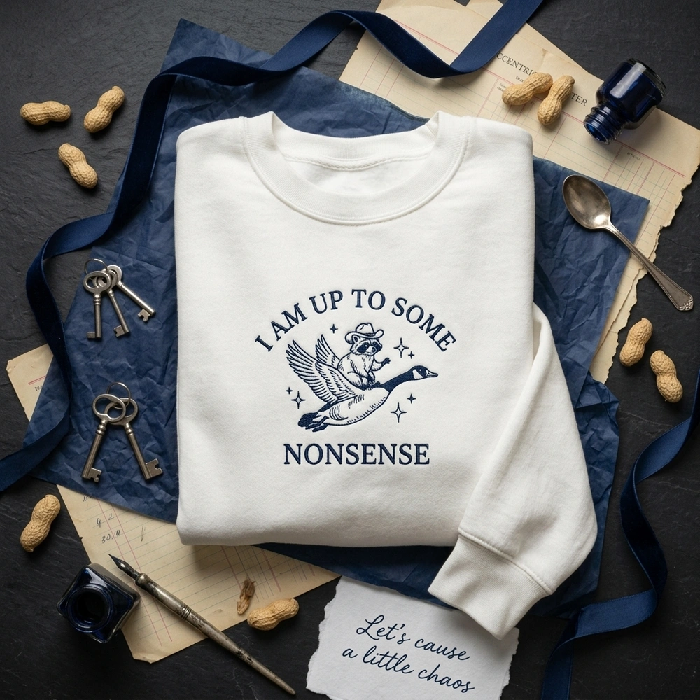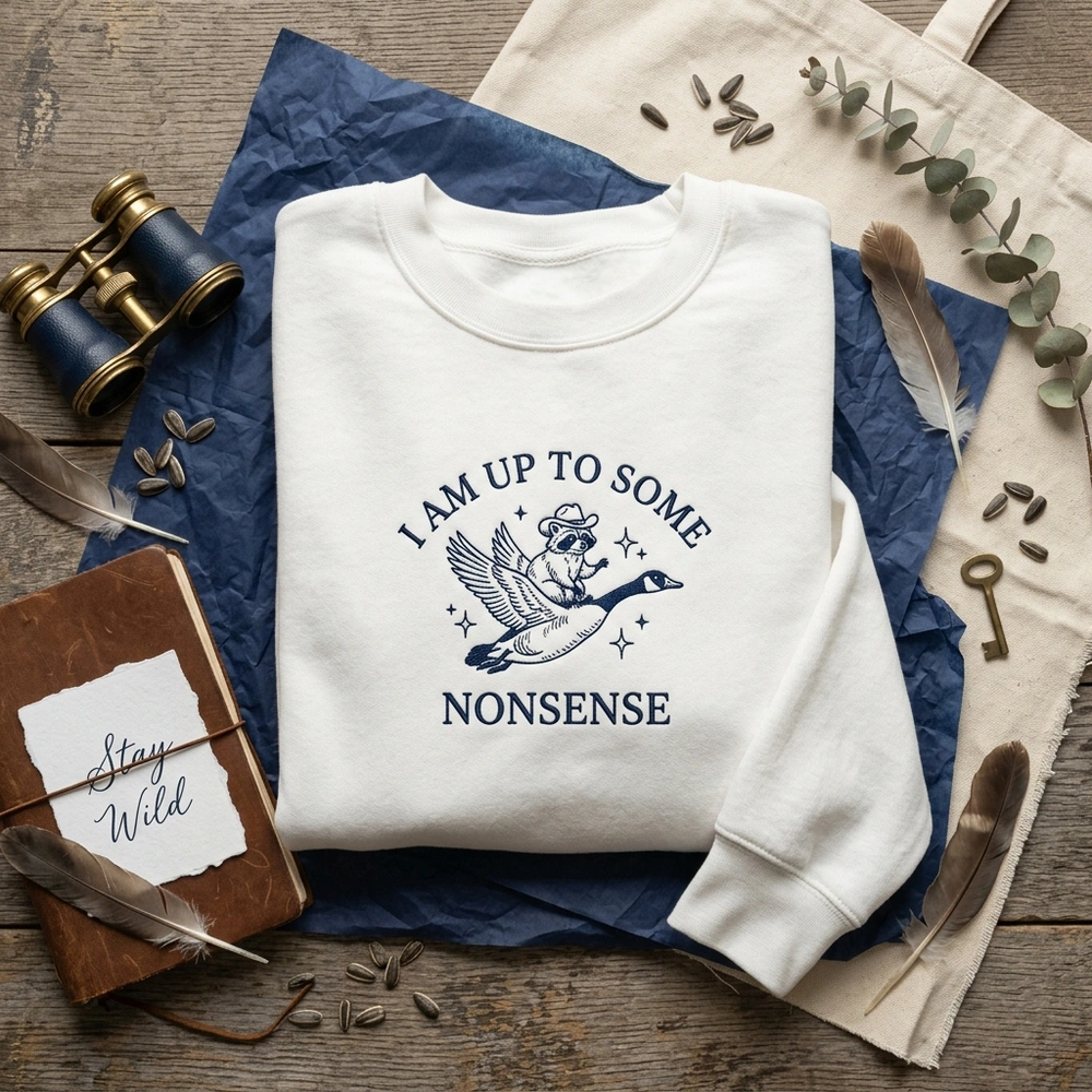 This intricate design features a raccoon in a detailed denim jacket and cowboy hat confidently riding a Canada goose. Measuring 20cm x 18cm, the embroidery uses a sophisticated combination of running stitches for fur texture and bold satin stitches for the “I AM UP TO SOME NONSENSE” arched typography. Rendered entirely in a single, high-contrast dark navy blue thread (#1A2B4C), the artwork pops beautifully against the Vintage White garment. The addition of four-point stars adds a touch of storybook flair to this chaotic scene, ensuring a timeless look on high-quality fabric.