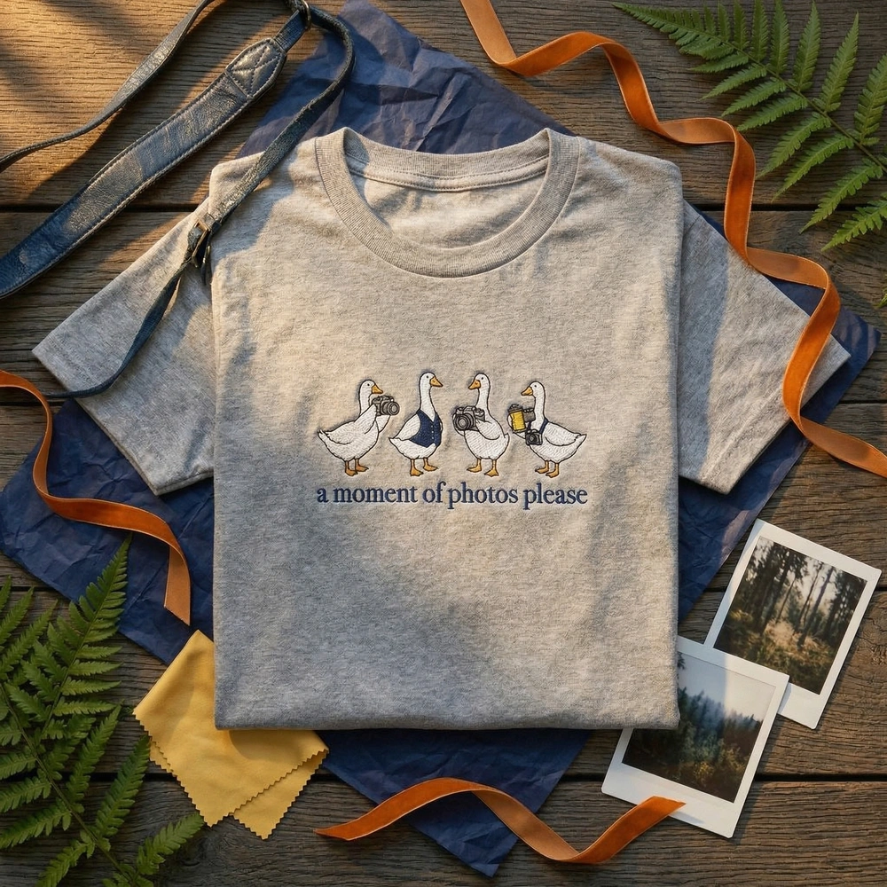 This original design is inspired by the viral ‘Silly Goose’ meme aesthetic combined with modern photography hobbyist culture. It plays on the ‘photo op’ and ‘paparazzi’ trends found across TikTok and Instagram, reimagined with wholesome, hardworking geese.
