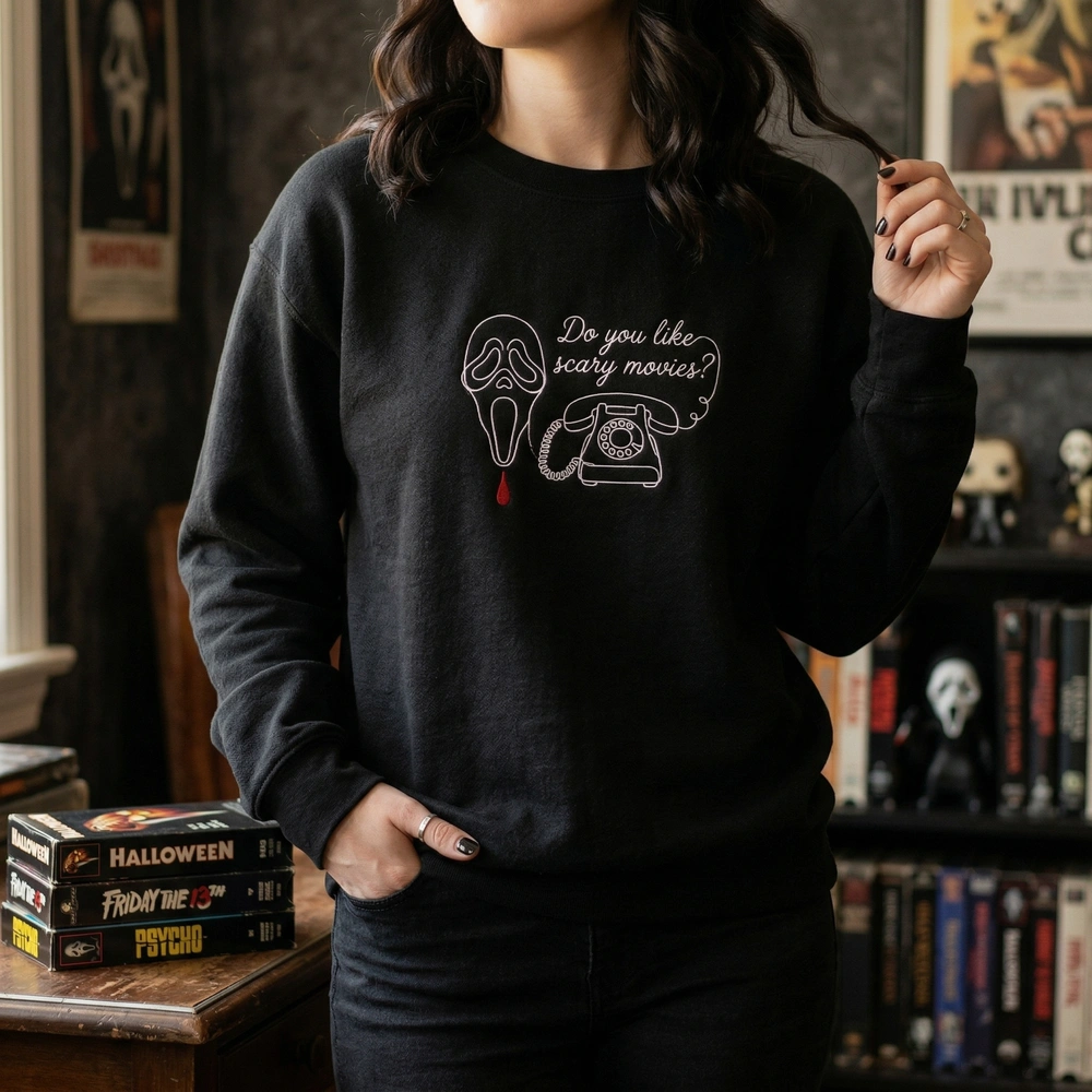 This exclusive design features a striking 20cm x 18cm embroidery field on a premium black garment. The artwork utilizes high-contrast #FFFFFF white line art to create a continuous, fluid silhouette of the Ghostface mask. Beside the mask, a retro 90s telephone is connected by a cord that loops to spell out “Do you like scary movies?”. To finish the look, a single drop of #D2042D blood red thread drips from the chin, providing a vibrant pop of color. Each piece is machine-embroidered with precision using high-quality thread for a durable, textured finish that outlasts standard screen prints.