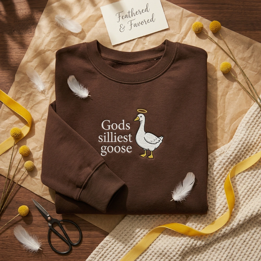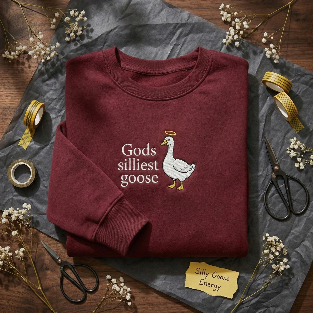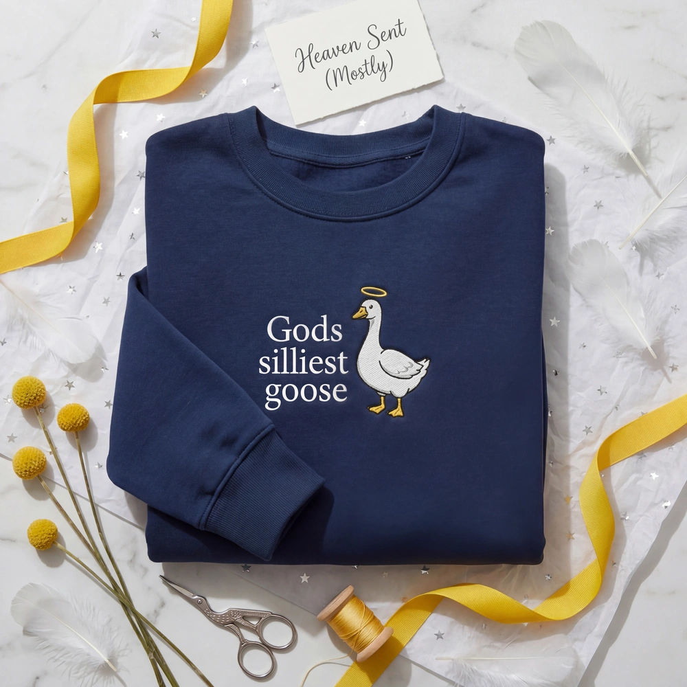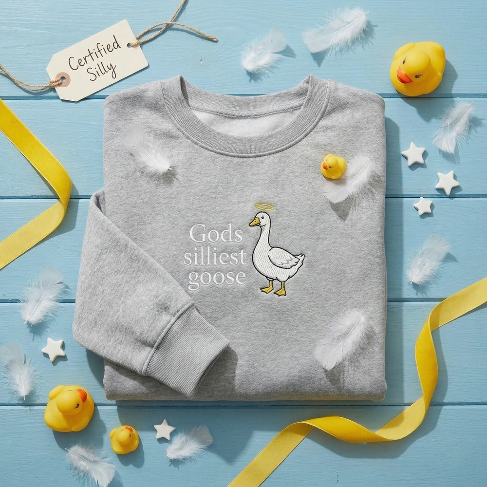 The God’s Silliest Goose Embroidered Sweatshirt is a premium machine-embroidered crewneck featuring a derpy goose design — perfect as a personalized gift.