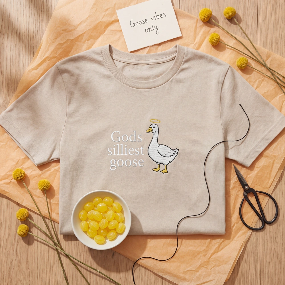 This design features a center-chest embroidery of a “derpy” white goose looking slightly to the side, complete with a floating yellow halo. We use a dense white fill-stitch for the body with light grey shading to provide realistic wing texture. The entire character is outlined in a crisp black running stitch for maximum clarity. To the left, the phrase “Gods silliest goose” is embroidered in a clean, white serif font. The design measures approximately 12cm x 10cm and utilizes four distinct thread colors (White, Black, Yellow, and Light Grey) for a high-quality, textured finish.