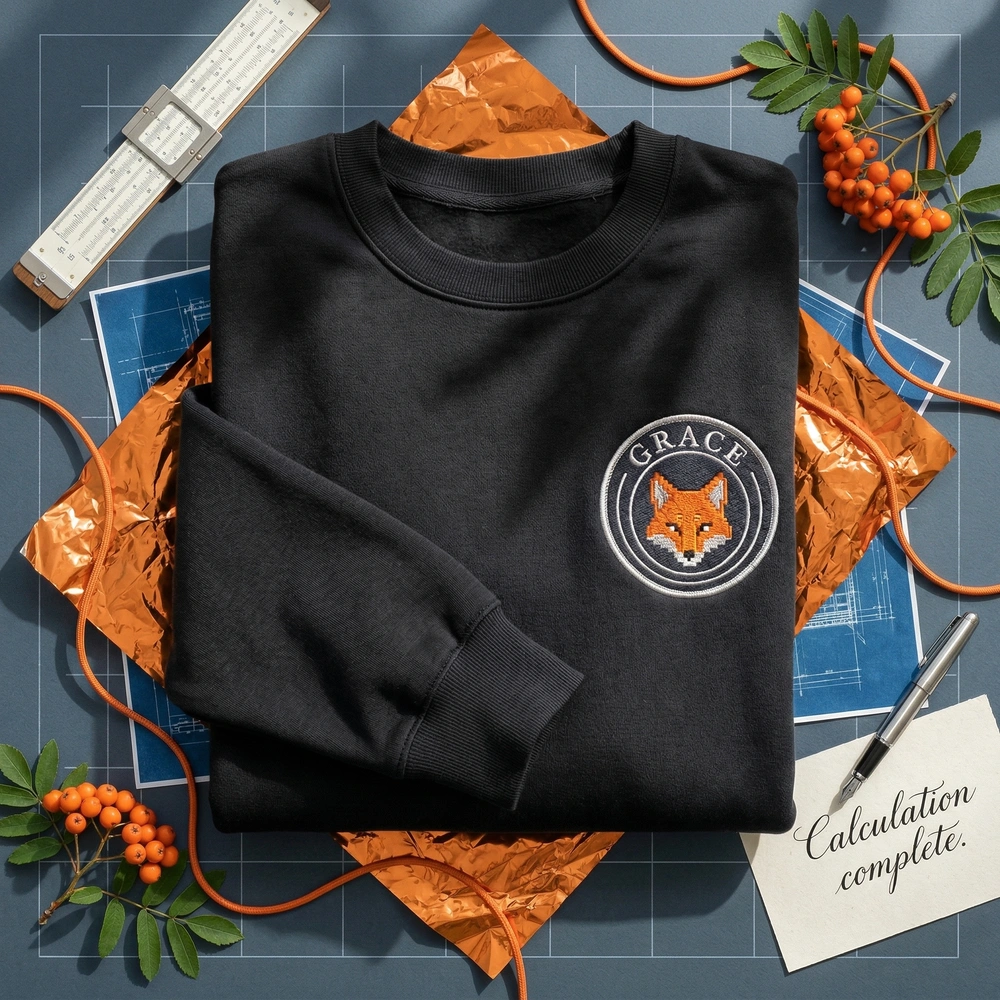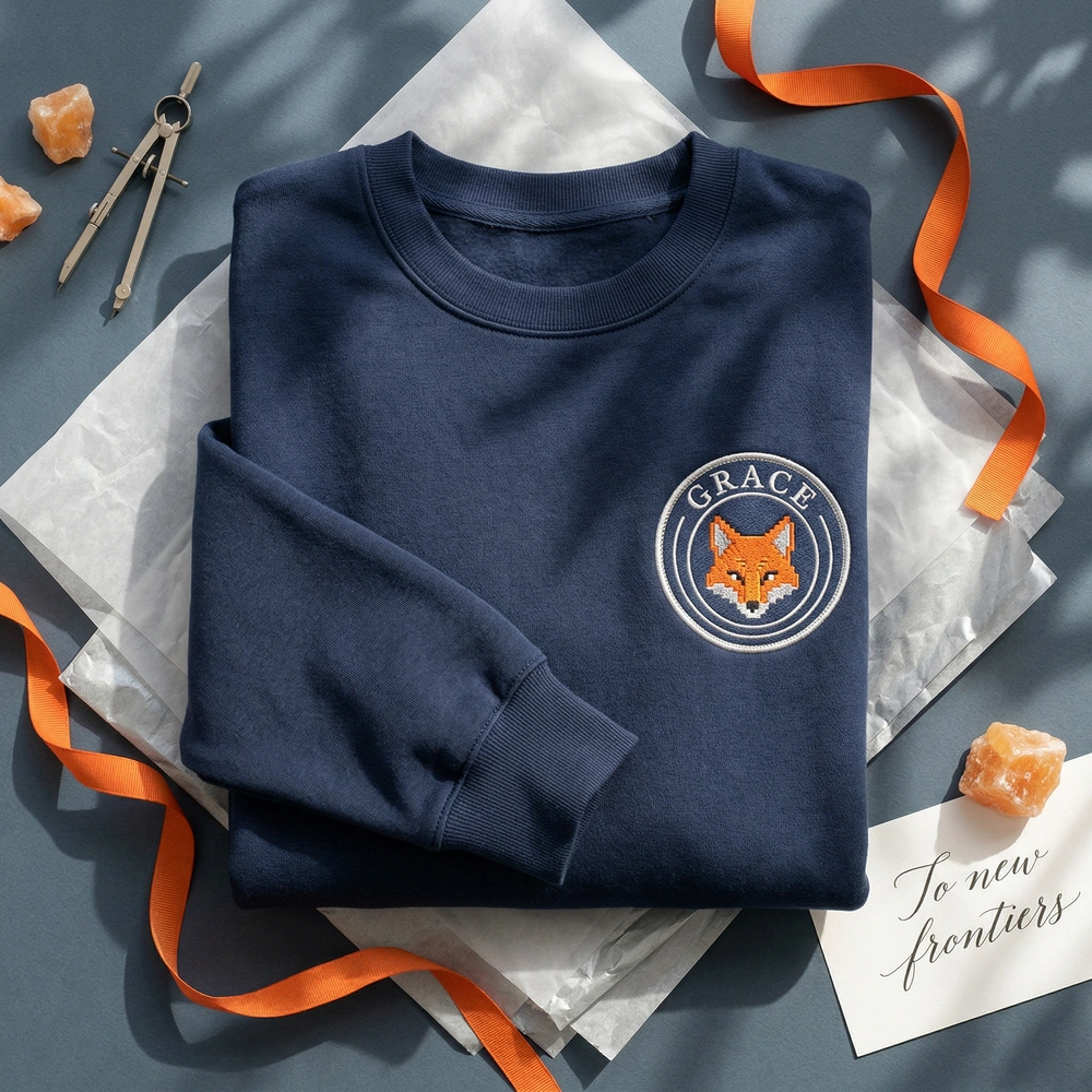 This design is expertly rendered as a left-chest mission patch, measuring exactly 9cm x 9cm. We use high-density embroidery with three distinct thread colors: vibrant Fox Orange (#E55B13), crisp White (#FFFFFF), and a technical Silver Grey (#CCCCCC). The pixelated, intarsia-style fox face is set within a circular border featuring the text “GRACE” in a classic astronaut font. This design pops beautifully against our deep Navy garment color, ensuring a professional and durable finish that lasts through every light-year of wear.