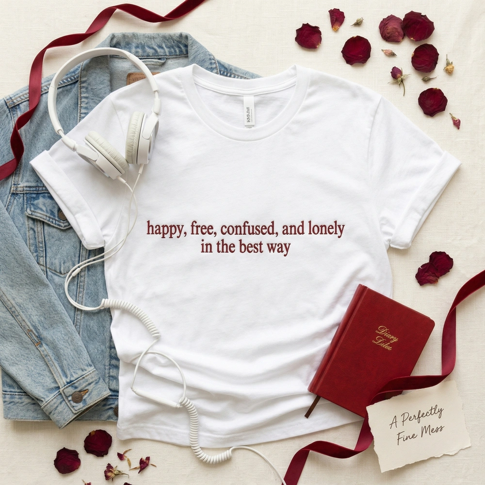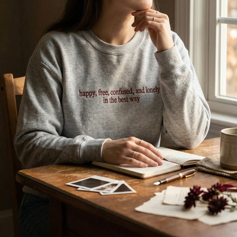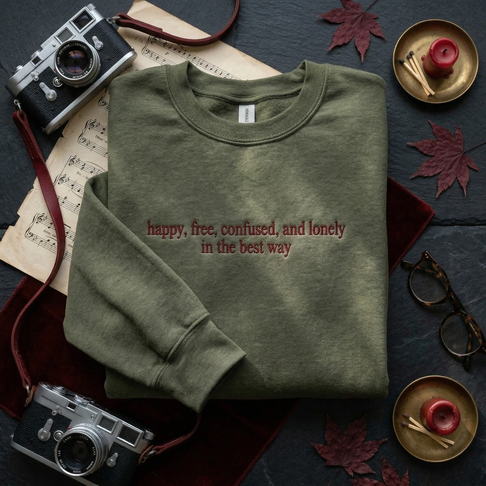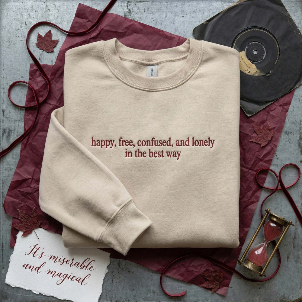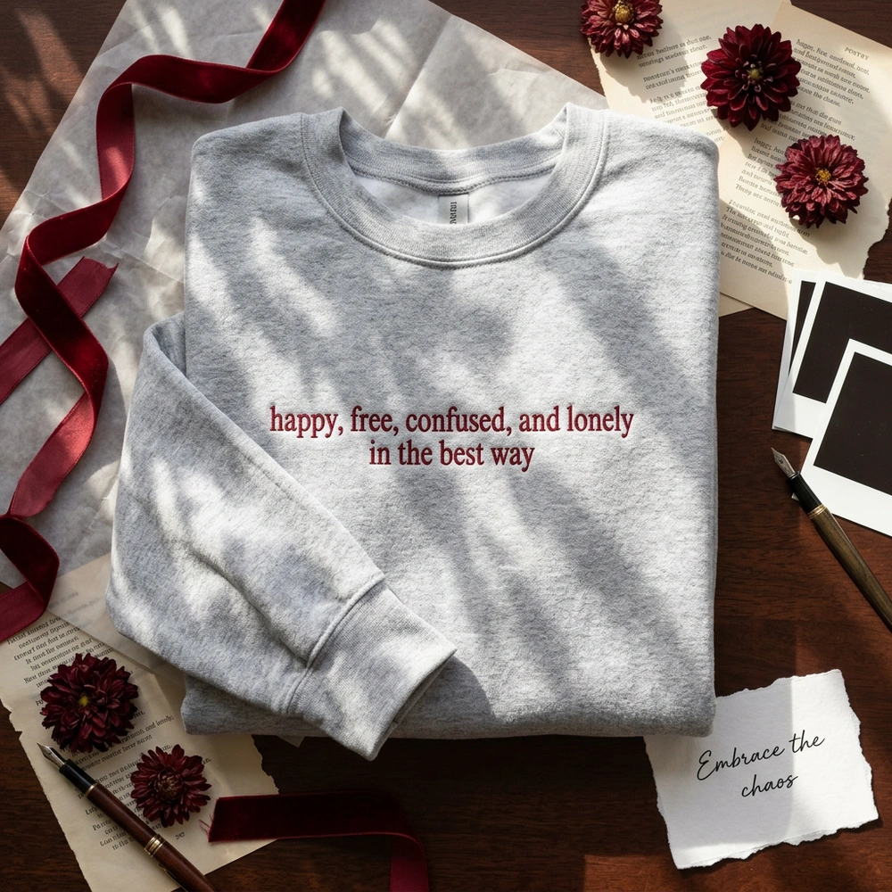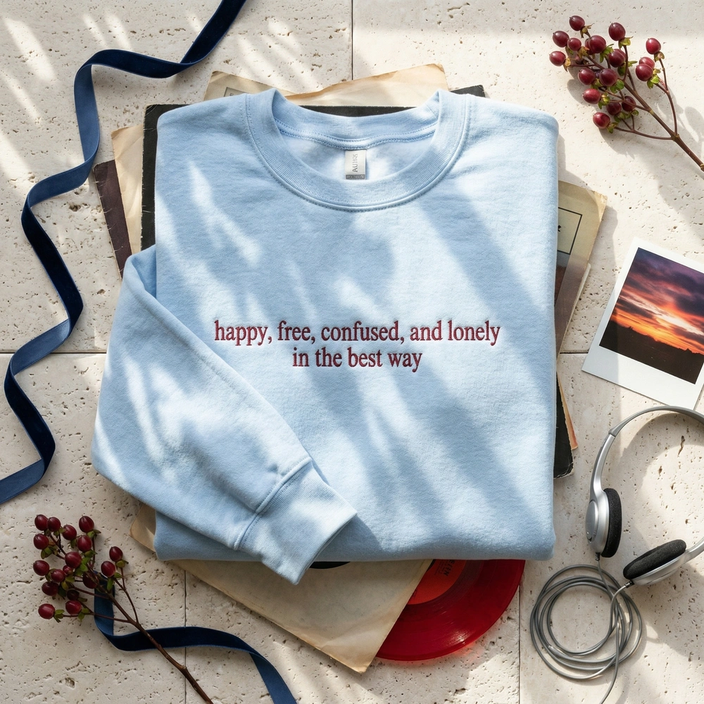 Embrace the beautiful chaos of early adulthood with our signature “Happy, Free, Confused, and Lonely” lyric sweatshirt. Designed for pop music fans and lovers of nostalgic, relatable apparel, this piece connects with the shared cultural experience of growing up. Whether you’re heading to a concert or curling up with a good book, this custom crewneck offers a timeless aesthetic that resonates with your personal journey.