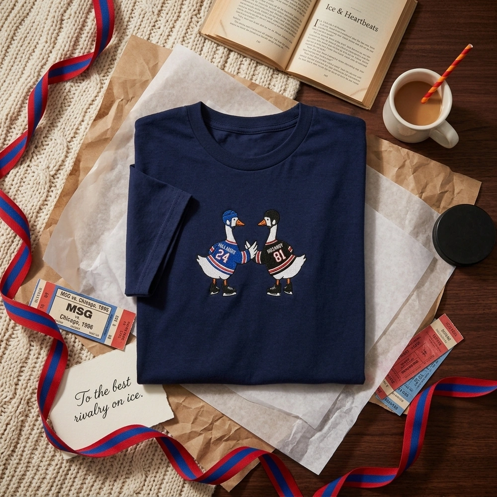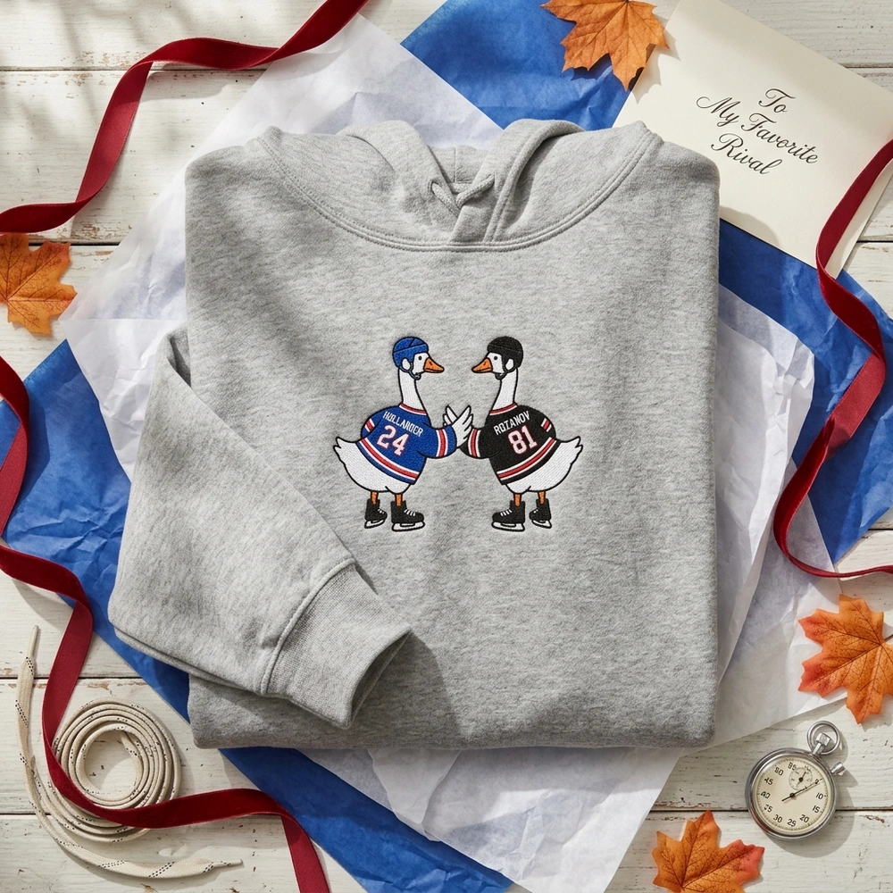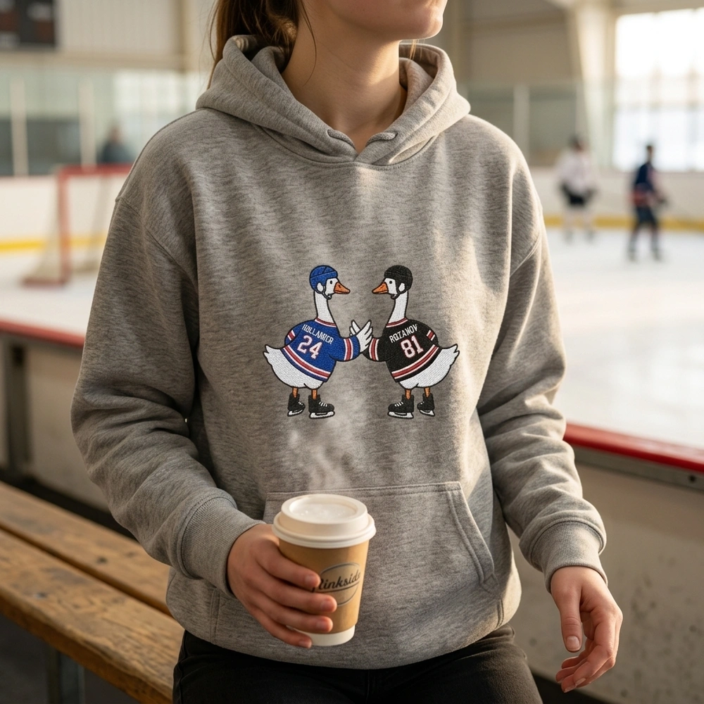 This intricately crafted design measures approximately 12cm wide and is perfectly centered on the chest. It features two white geese holding wings, dressed as iconic hockey players. The goose on the left sports a royal blue helmet and jersey with red and white striping, displaying ‘HOLLANDER’ and ’24’. The goose on the right wears a black helmet and jersey with ‘ROZANOV’ and ’81’. Utilizing 5 distinct thread colors, the embroidery combines solid fill stitches for the bright white bodies and colorful jerseys with crisp black satin stitching for sharp, readable outlines. Bright orange beaks and legs add the perfect pop of warm color.