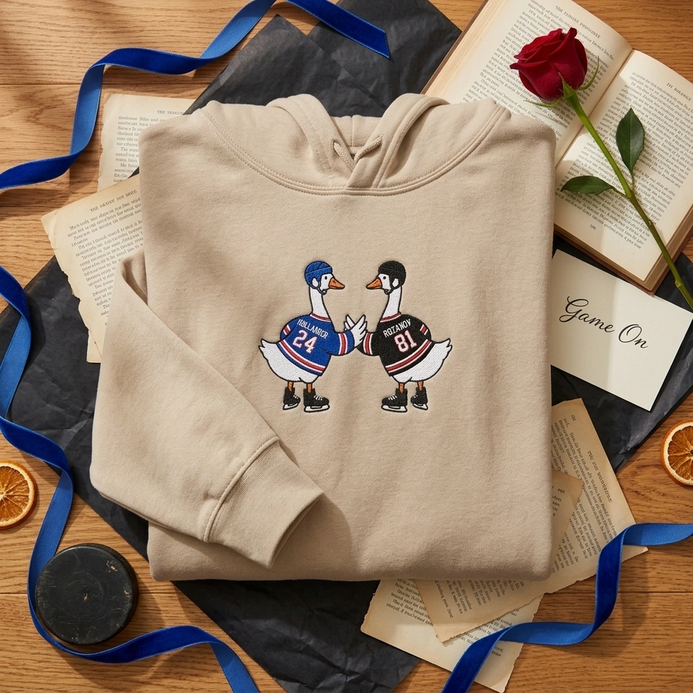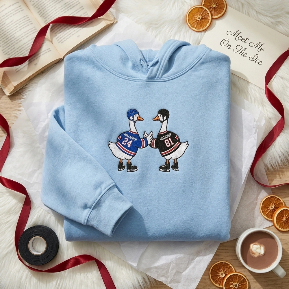 The Heated Rivalry Hockey Geese Embroidered Hoodie is a premium machine-embroidered sweatshirt featuring an adorable sports romance bookish design.