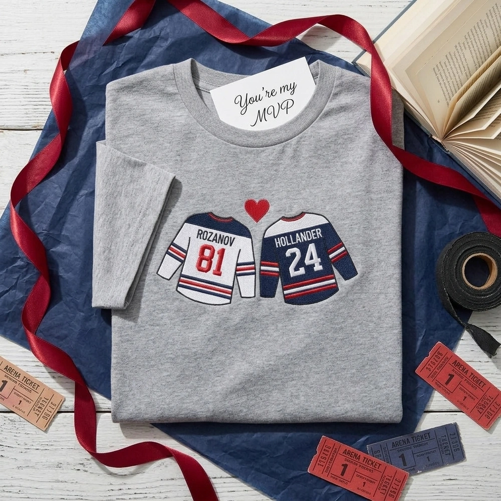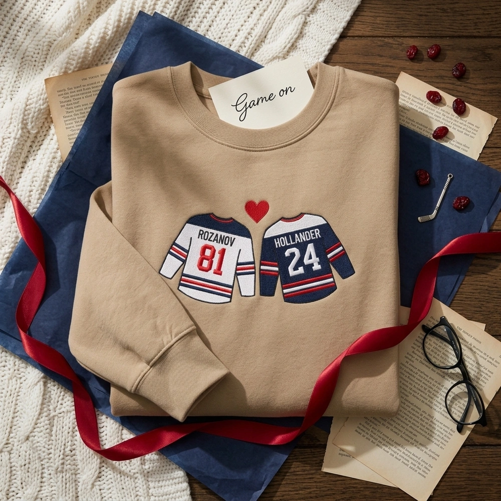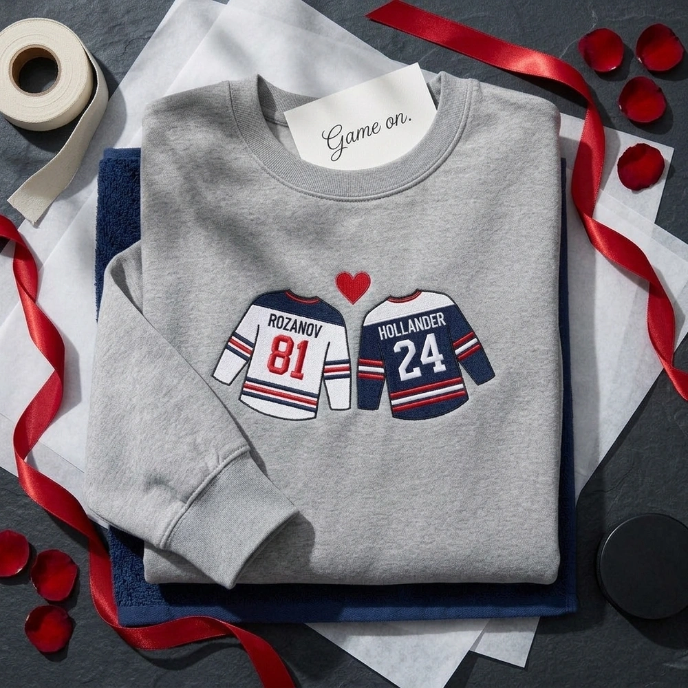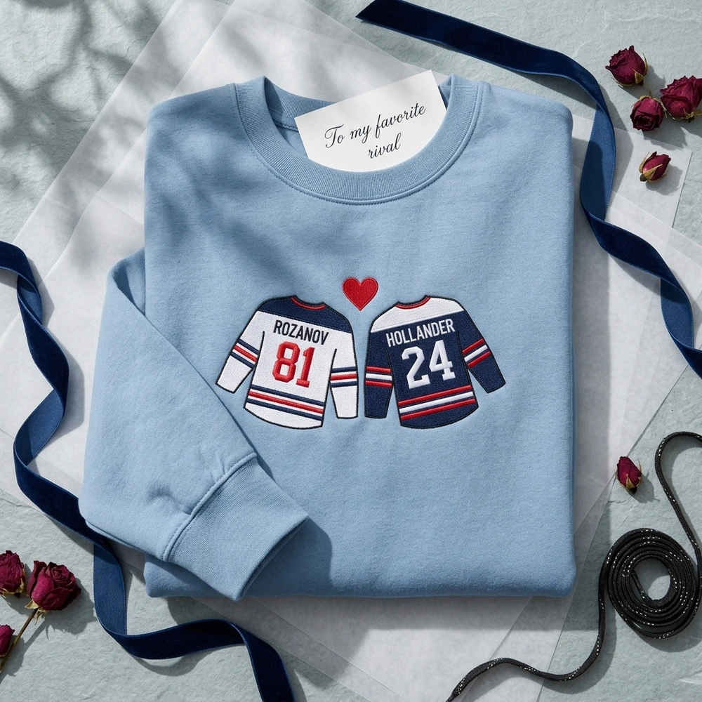The Lollidollyart Heated Rivalry Rozanov & Hollander Embroidered Sweatshirt is a premium machine-stitched crewneck featuring iconic hockey jersey designs—perfect for personalized gifts.